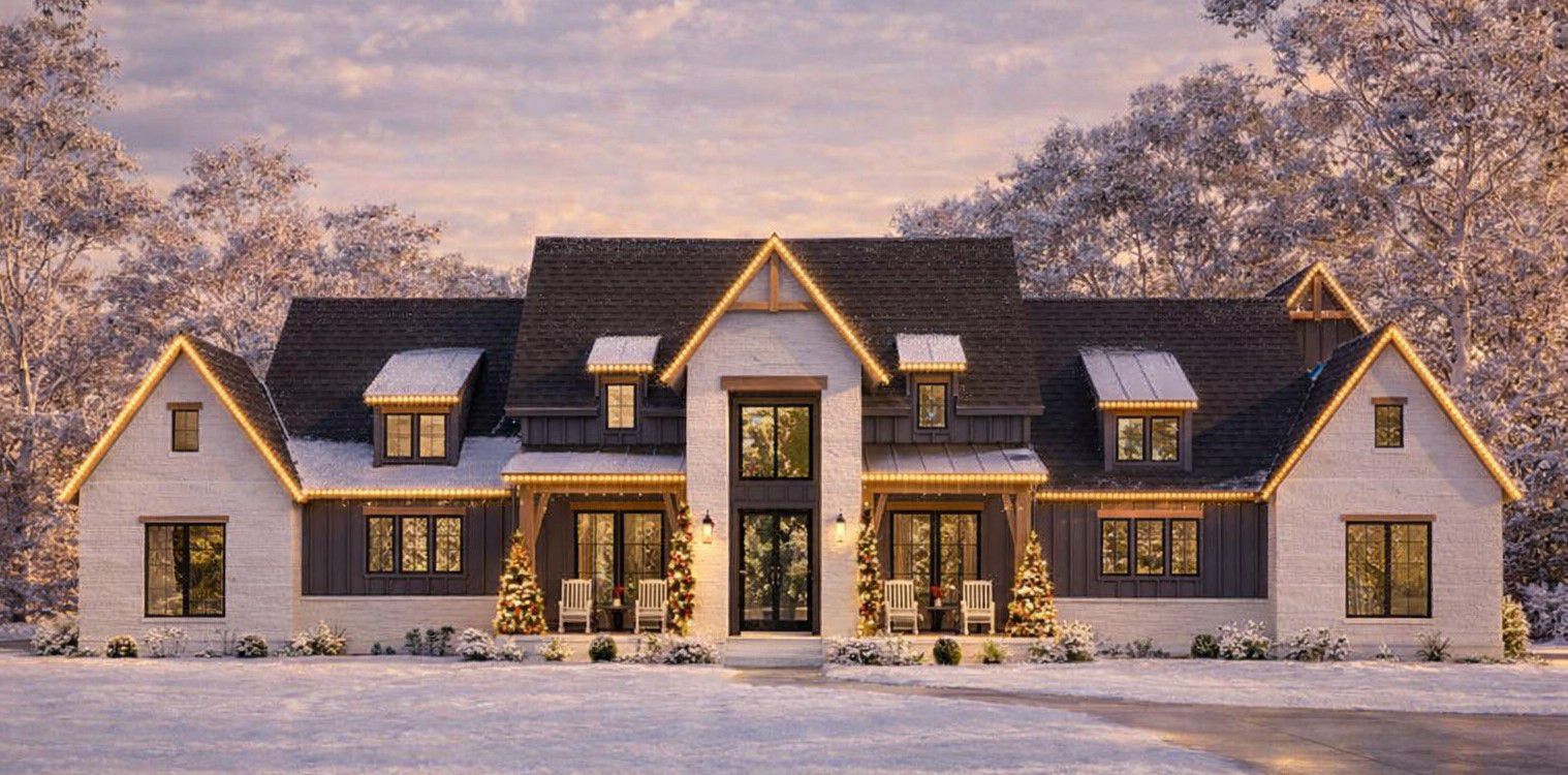 The exterior of this plan showcases timeless modern farmhouse features with clean lines, gabled roof forms, and a welcoming covered front porch. This design’s generous footprint (about **106′ 4″ wide by 94′ deep**) creates a strong presence on large lots while maintaining a balanced, refined façade. 1