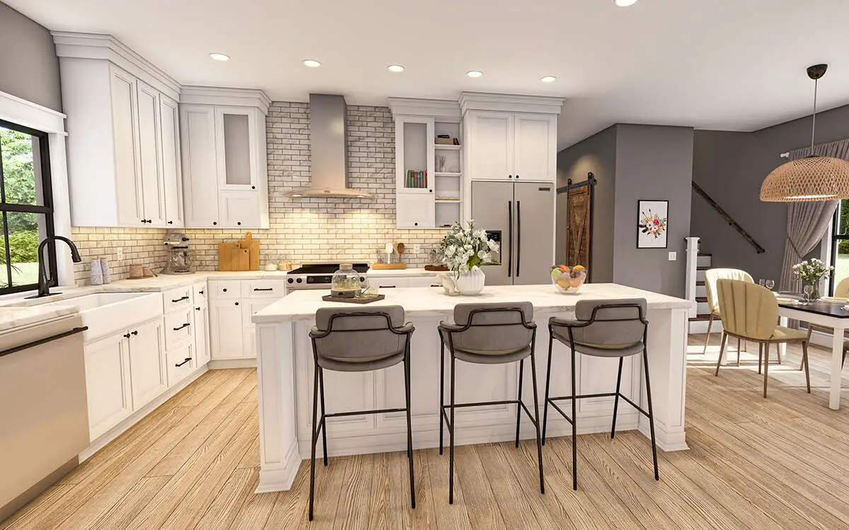 The **vaulted family room** anchors the layout with a cozy fireplace and flows naturally into the adjacent dining area and **L-shaped kitchen**—ideal for everyday living and social gatherings. 2