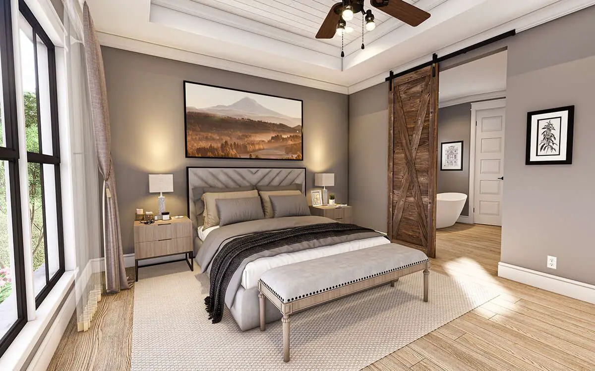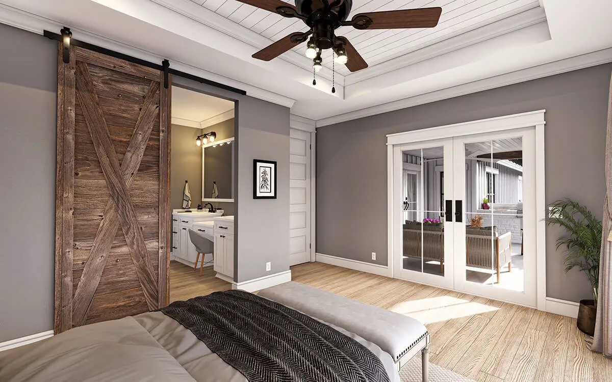 This plan’s flexible layout accommodates **3 to 4 bedrooms**. The owner’s suite occupies a peaceful wing on one side of the home. It features access to the rear outdoor area, a private ensuite bathroom with dual sinks and shower, and a spacious walk-in closet. 4