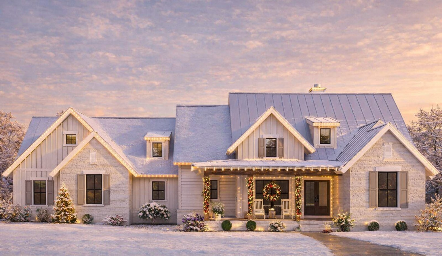 The exterior features classic modern farmhouse elements including board-and-batten siding, multiple gables, and dormer accents that create lasting curb appeal.