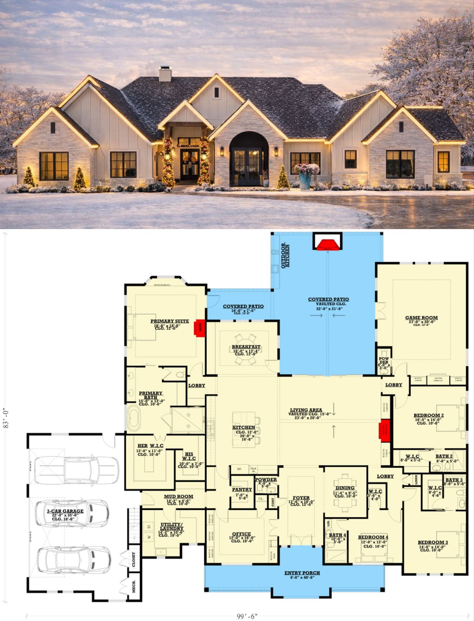 This plan’s exterior combines board-and-batten, clapboard, and brick accents to create a timeless transitional farmhouse façade with welcoming curb appeal. With a width of about 99′ 6″ and a depth of 83′ 0″, it makes a balanced impression on medium to large lots.