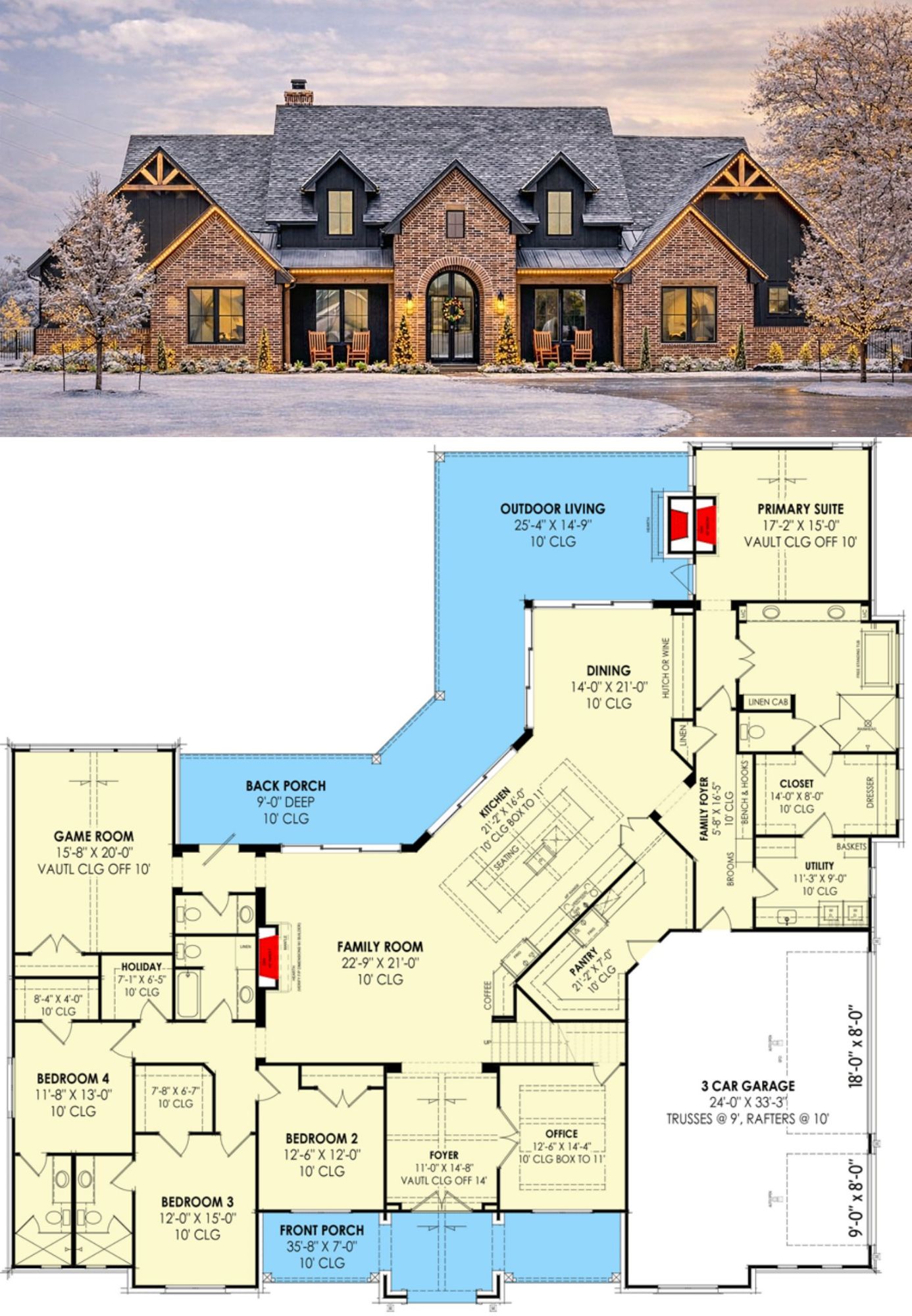 This transitional home plan is designed around family life with both welcoming shared spaces and secluded retreats. The open layout encourages connection while the separated bedroom zones support privacy and comfort. Flexible spaces such as the home office, vaulted game room, and bonus room allow you to tailor the layout to your lifestyle—whether you require work-from-home space, entertainment zones, or future expansion. 21
