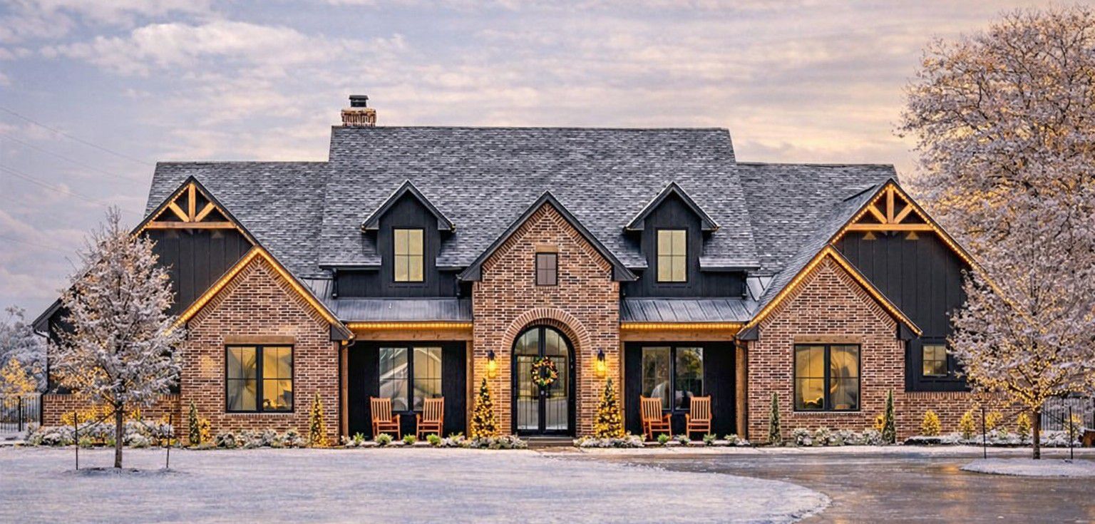 This transitional design uses a harmonious mix of brick, wood, and metal for a warm yet refined façade with perfect symmetry.