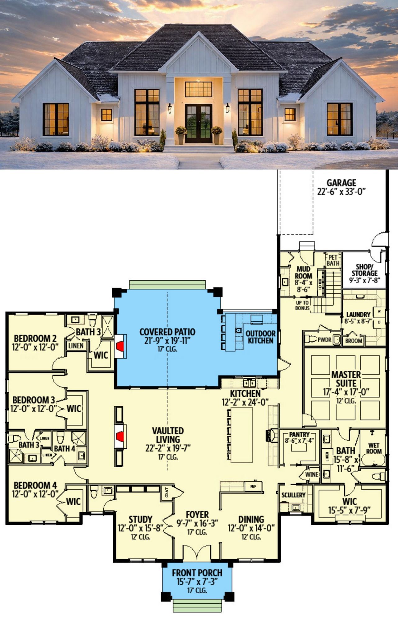 This transitional style plan emphasizes spacious, light-filled interiors with a dramatic two-story great room and functional flow between shared spaces. With a primary suite on the main level and secondary bedrooms thoughtfully located for privacy, the layout supports both daily living and entertaining. Outdoor living areas expand usable space and enhance indoor-outdoor connection.