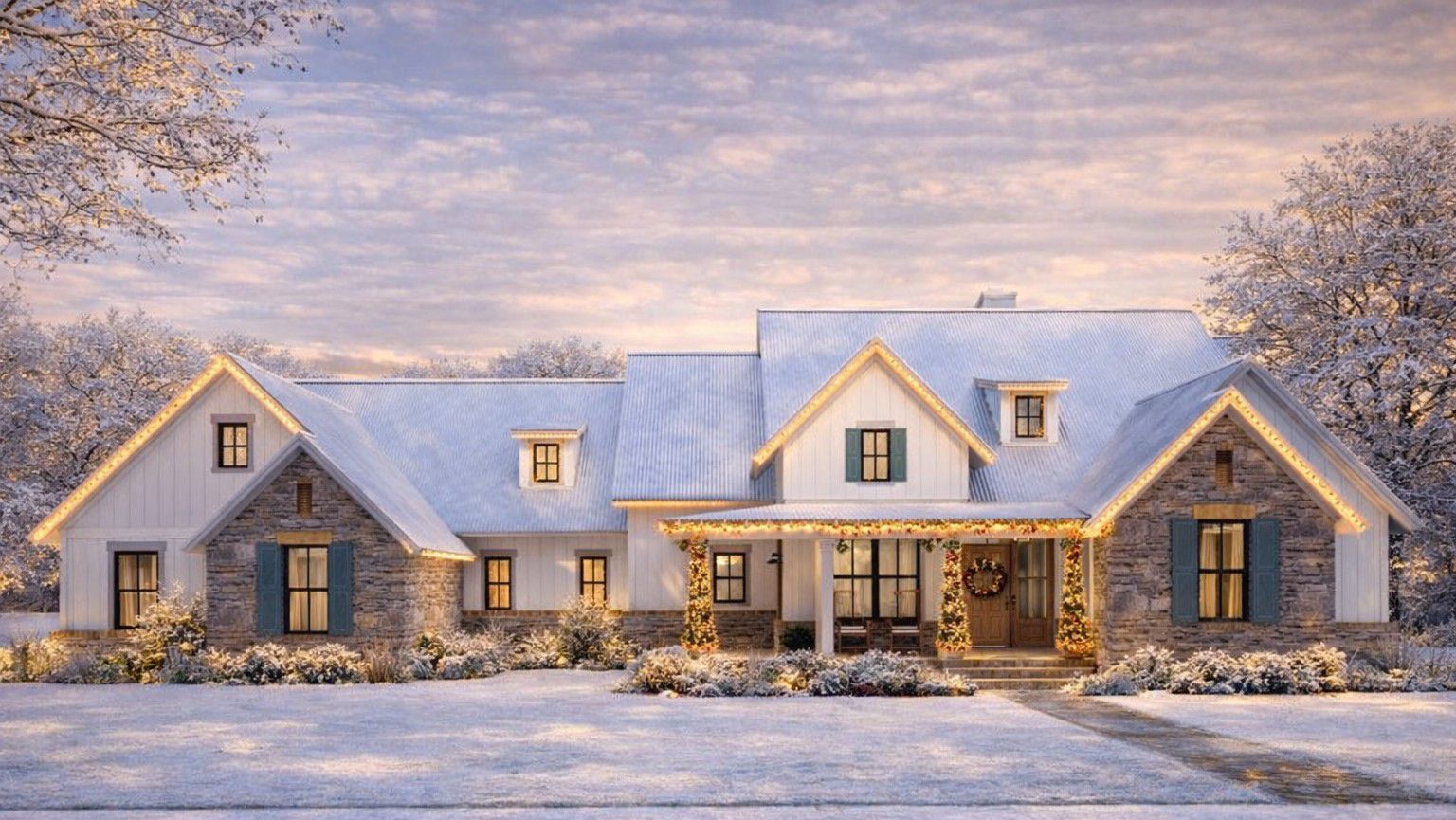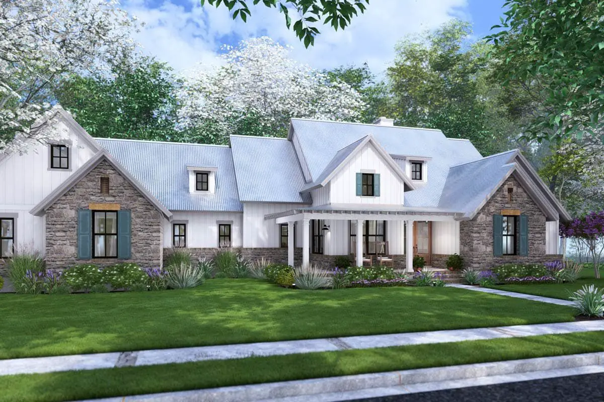 This design showcases classic modern farmhouse elements, including clean lines, board-and-batten siding, and a welcoming front porch that spans much of the façade.