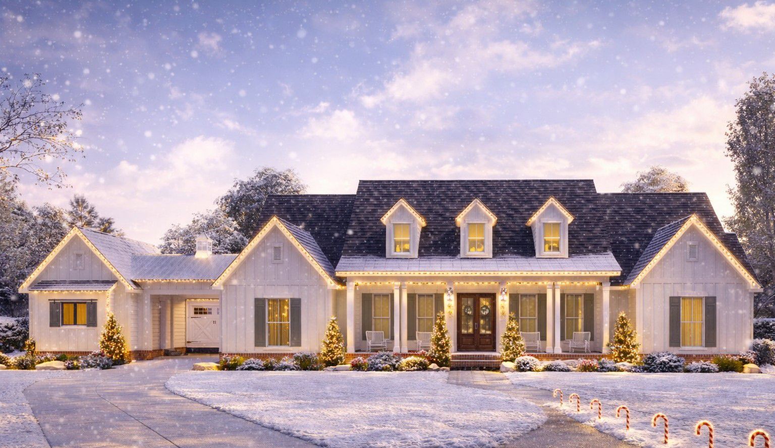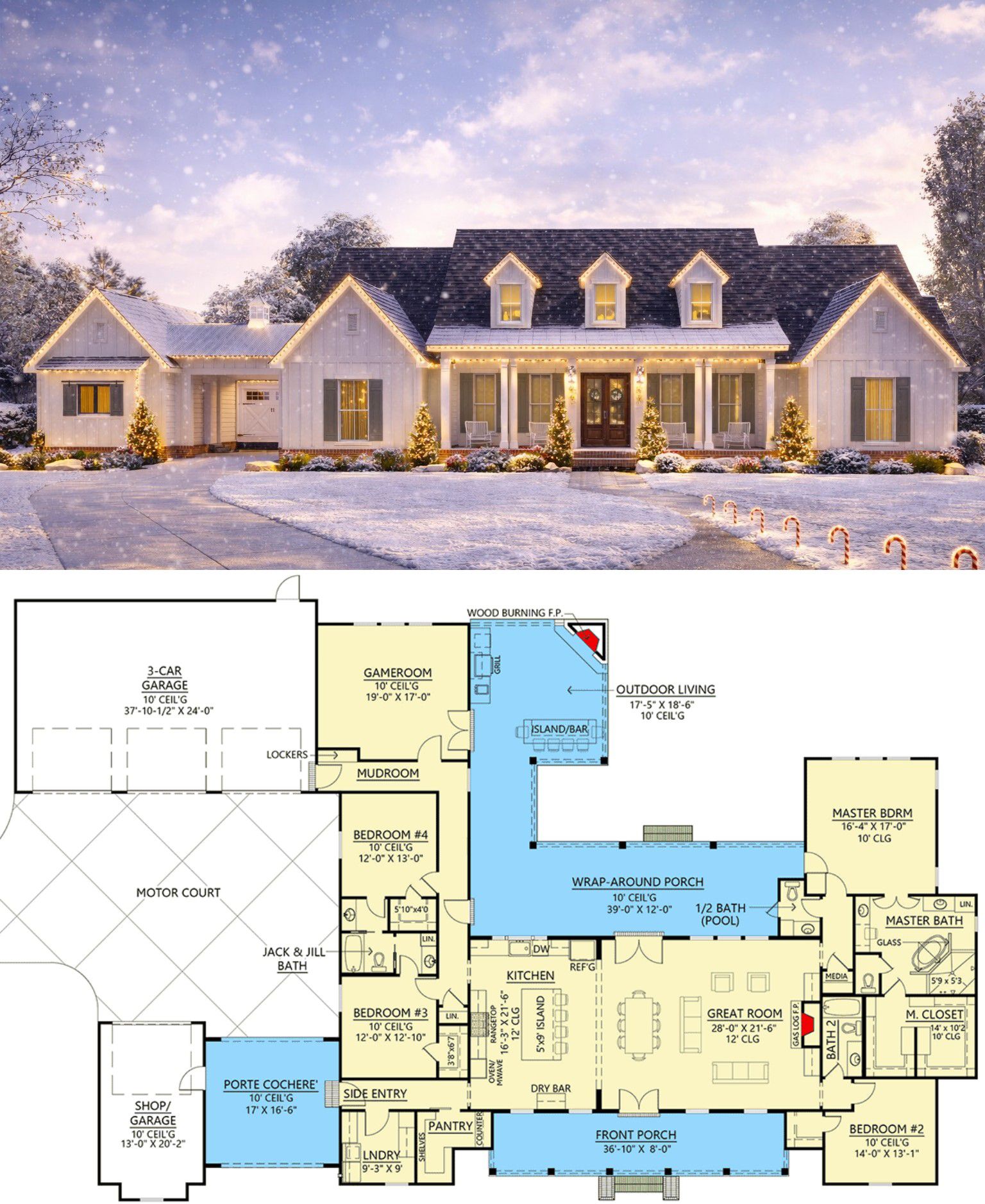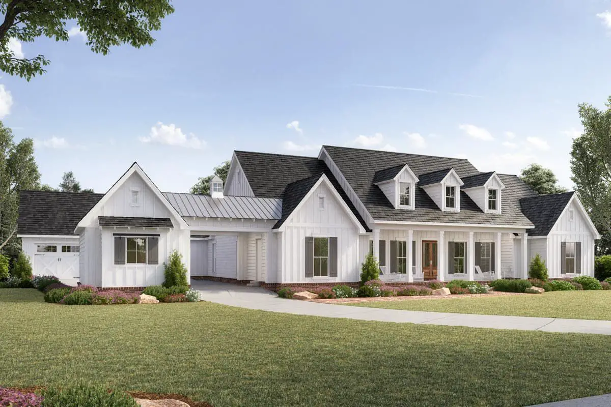 This design offers approximately 3,272 square feet of heated living space, featuring **4 bedrooms**, **3 full bathrooms**, **1 half bathroom**, and a **4-car garage** with a porte cochere and workshop bay—perfect for families who love style, space, and flexibility.