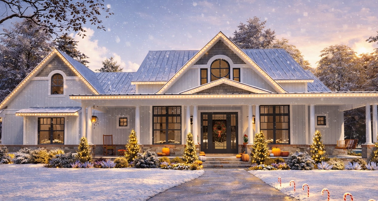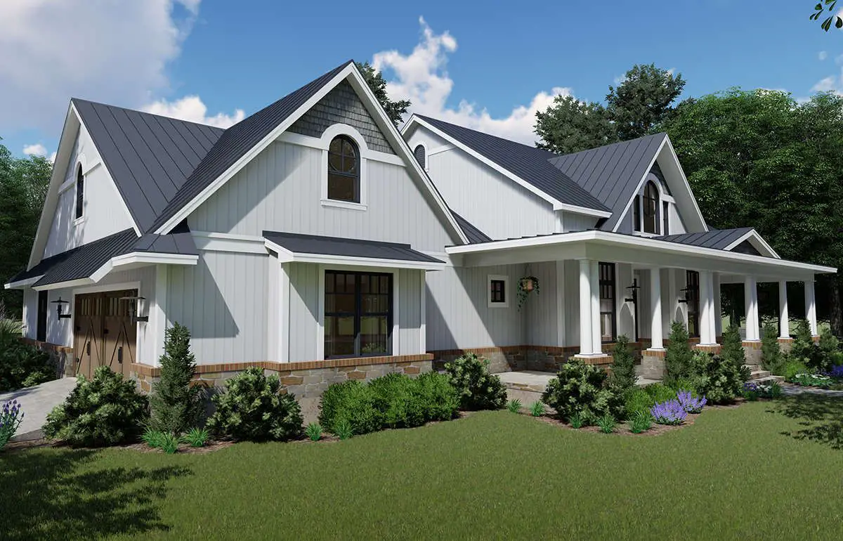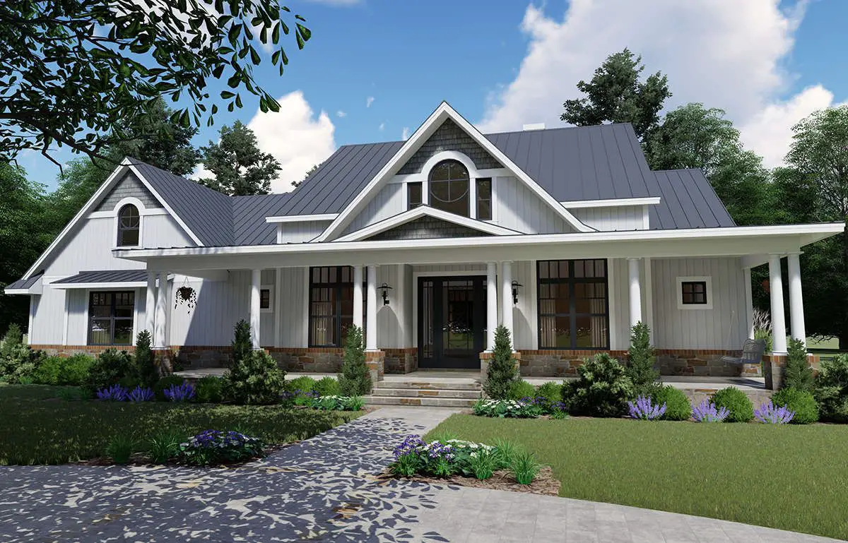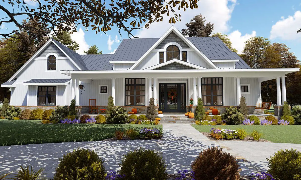 This country home embraces traditional design elements with a welcoming façade measuring about 78′-6″ wide by 68′-9″ deep. A balanced roofline, classic materials, and generous porch areas contribute to its timeless curb appeal. 1