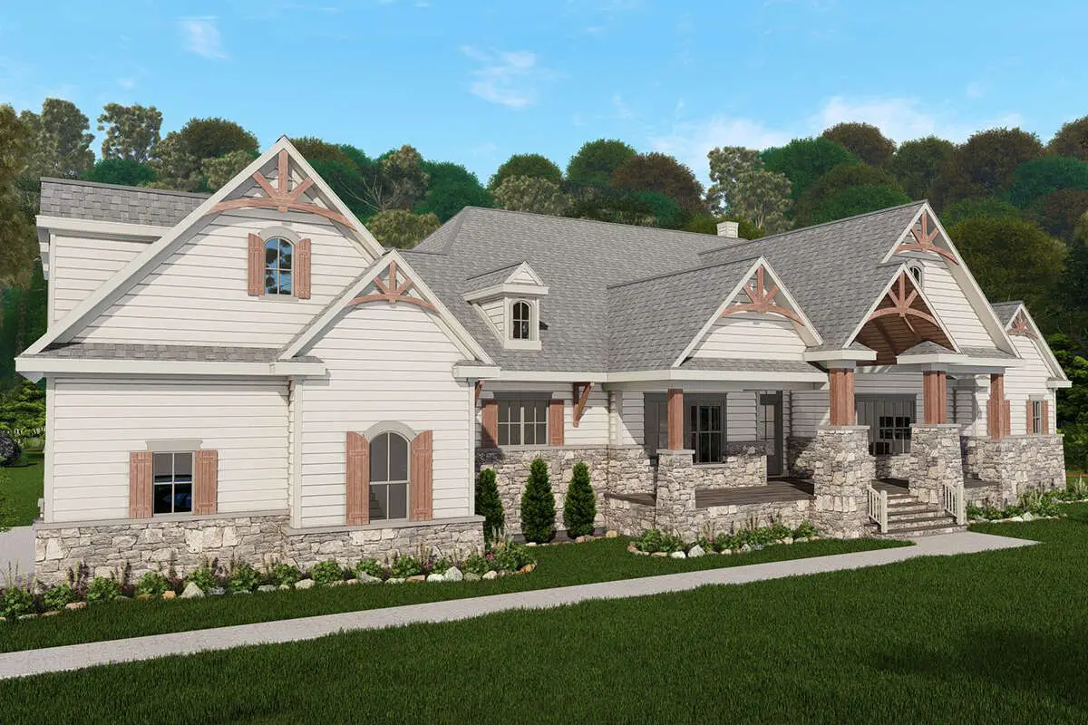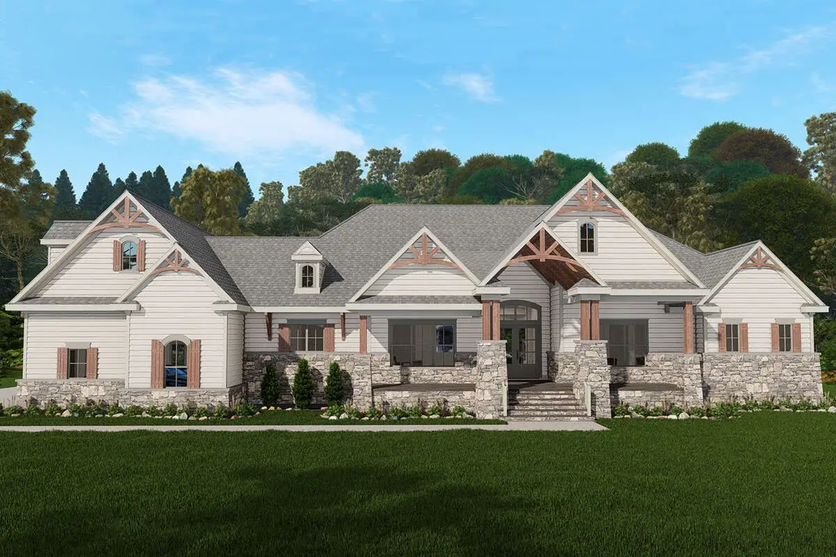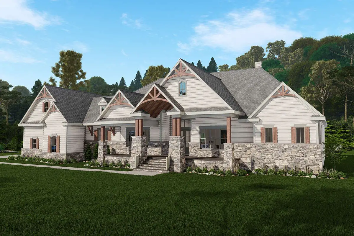 This plan features thoughtful Craftsman architectural details, such as a balanced façade with mixed siding, covered porches, and detailed rooflines.