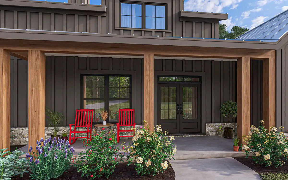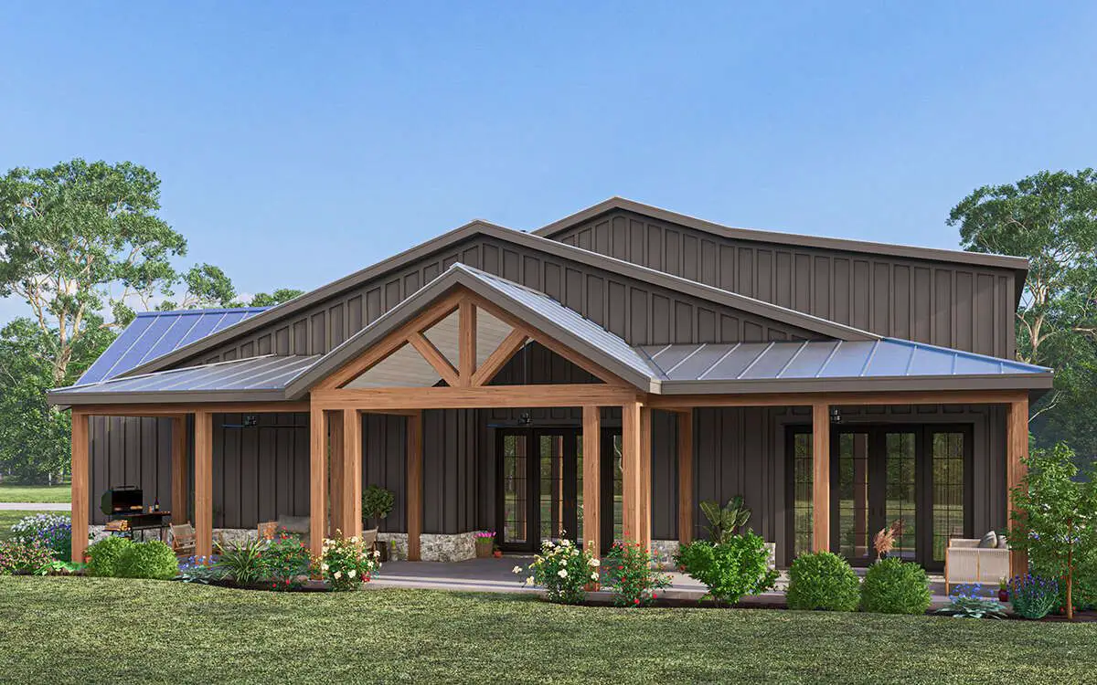 The exterior embraces classic barn influence with simple lines, tall roof pitches, and metal or board-and-batten siding options that create an eye-catching façade.