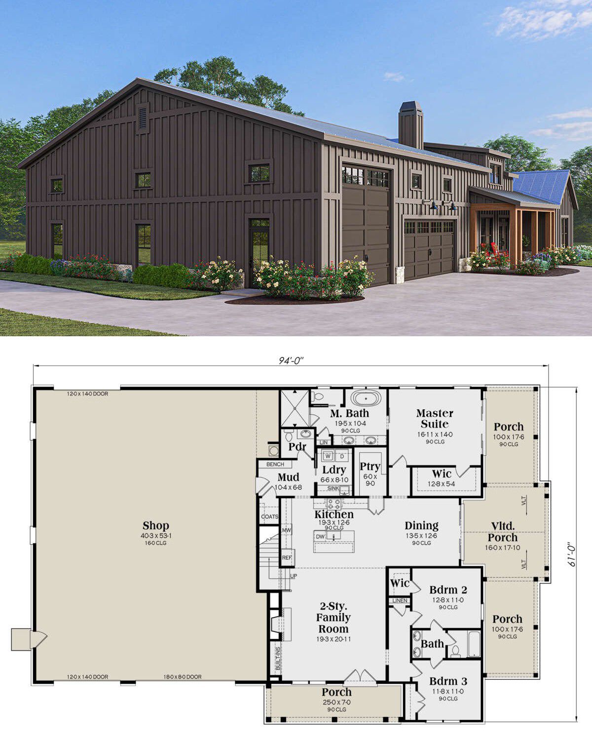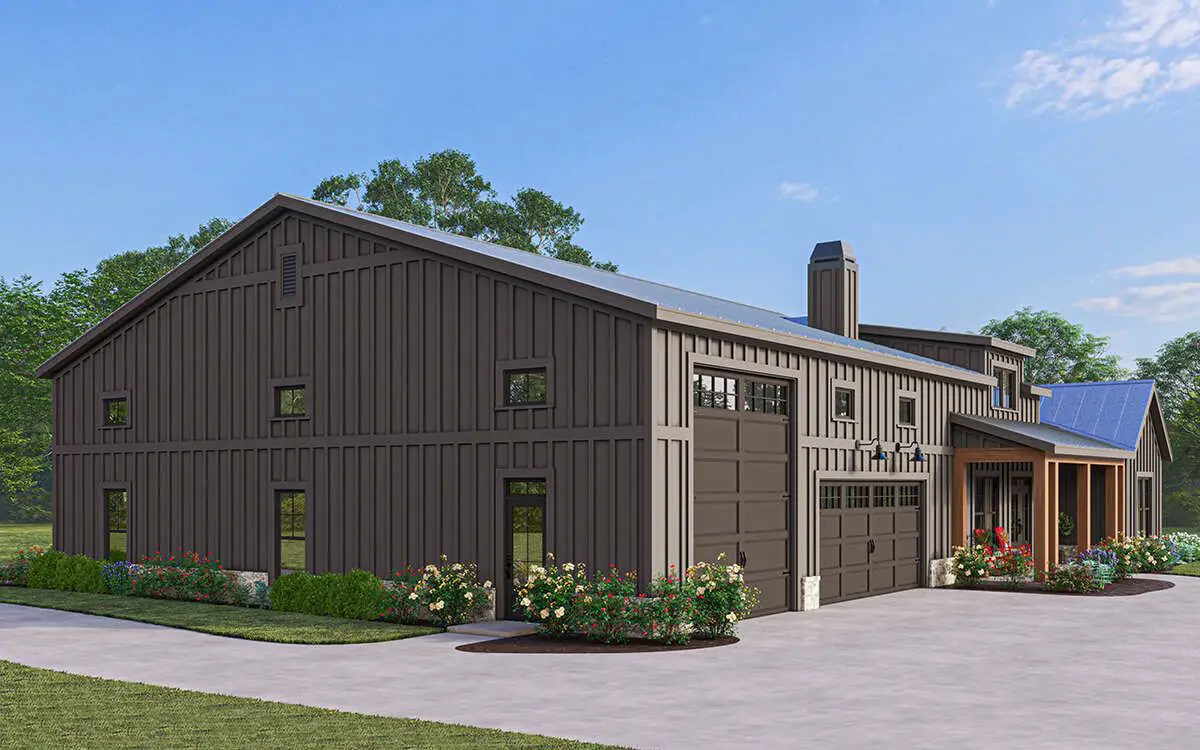 This **barndominium plan** combines rustic barn-inspired charm with modern ranch-style functionality.