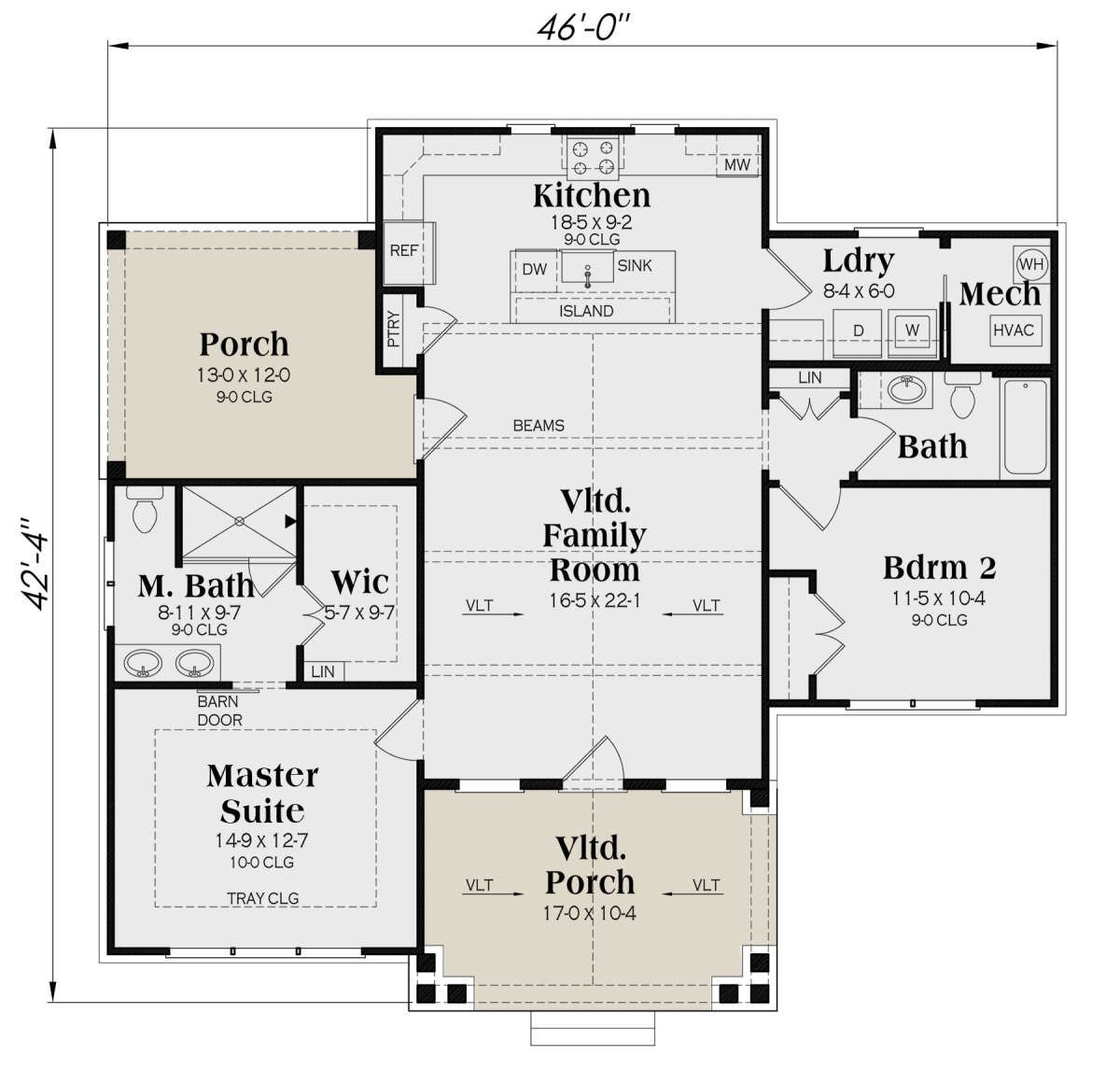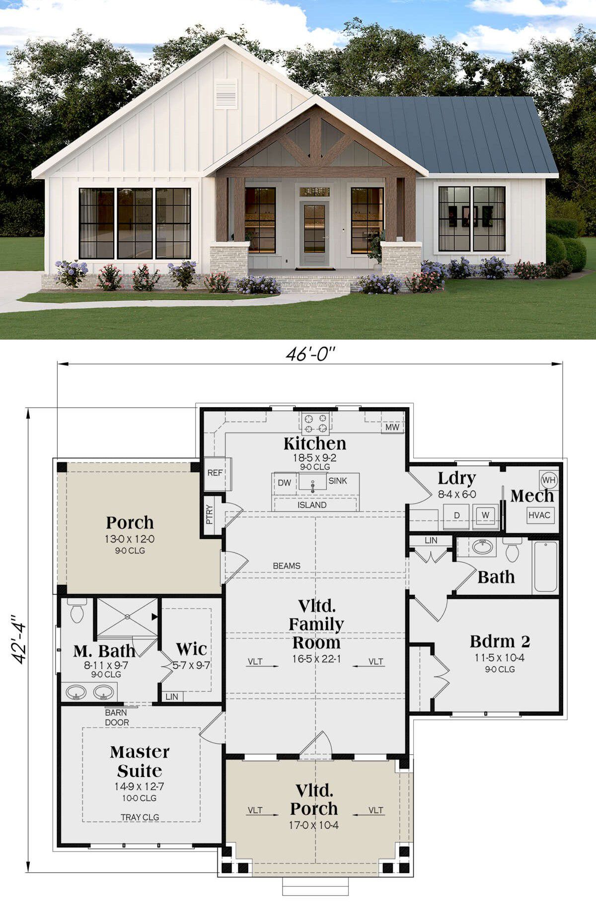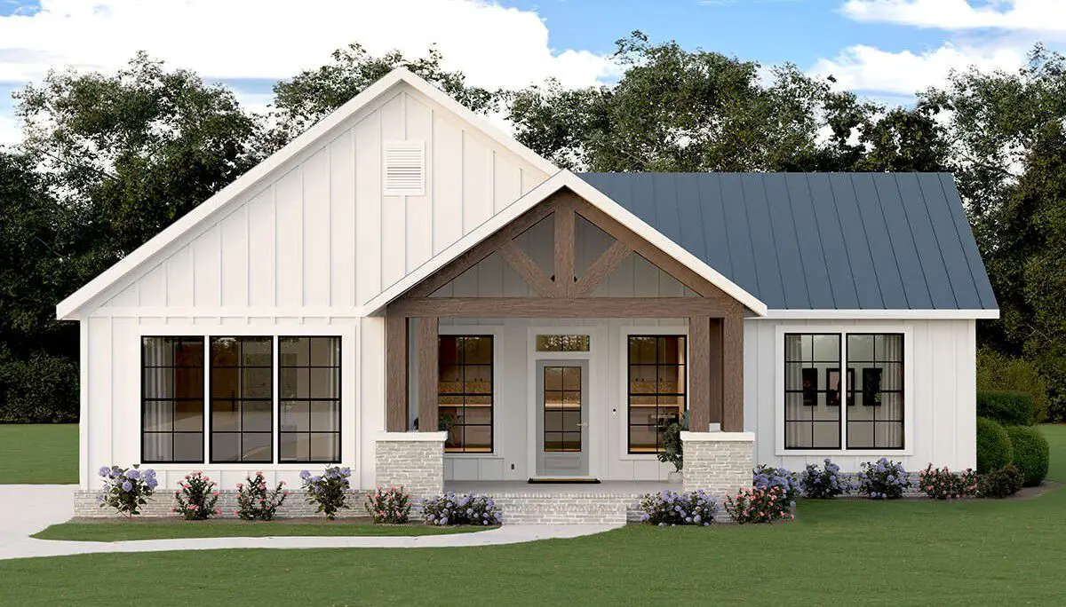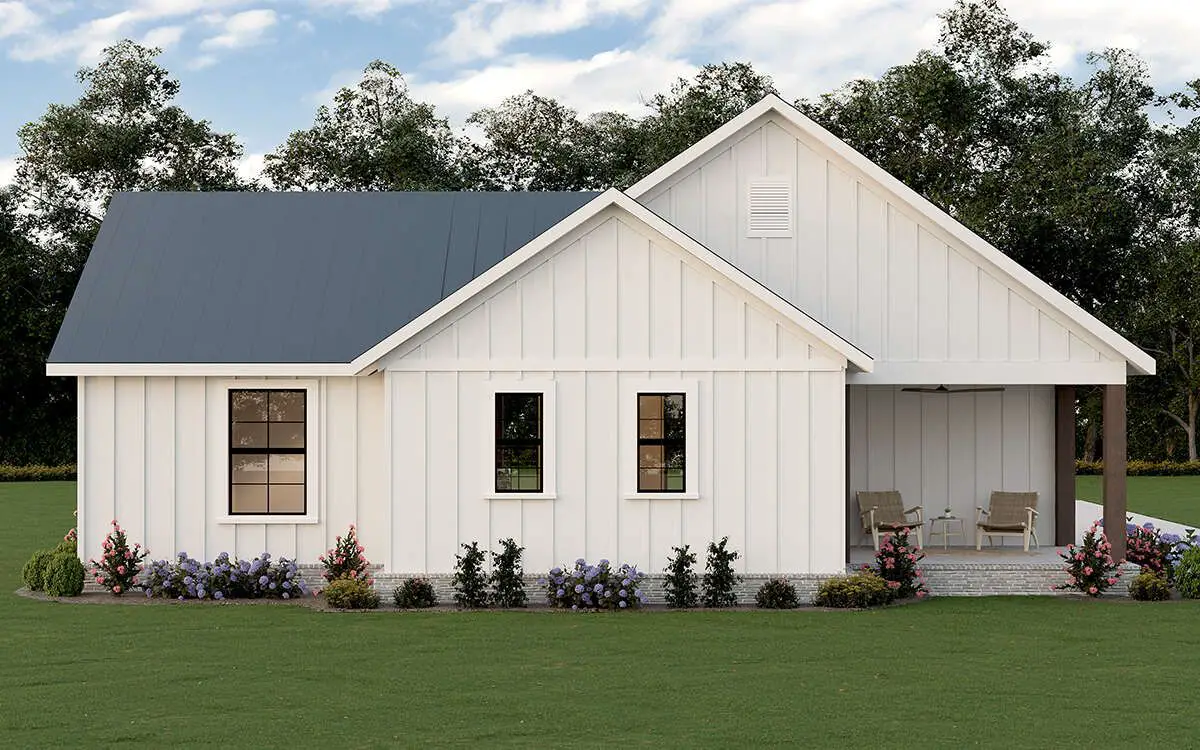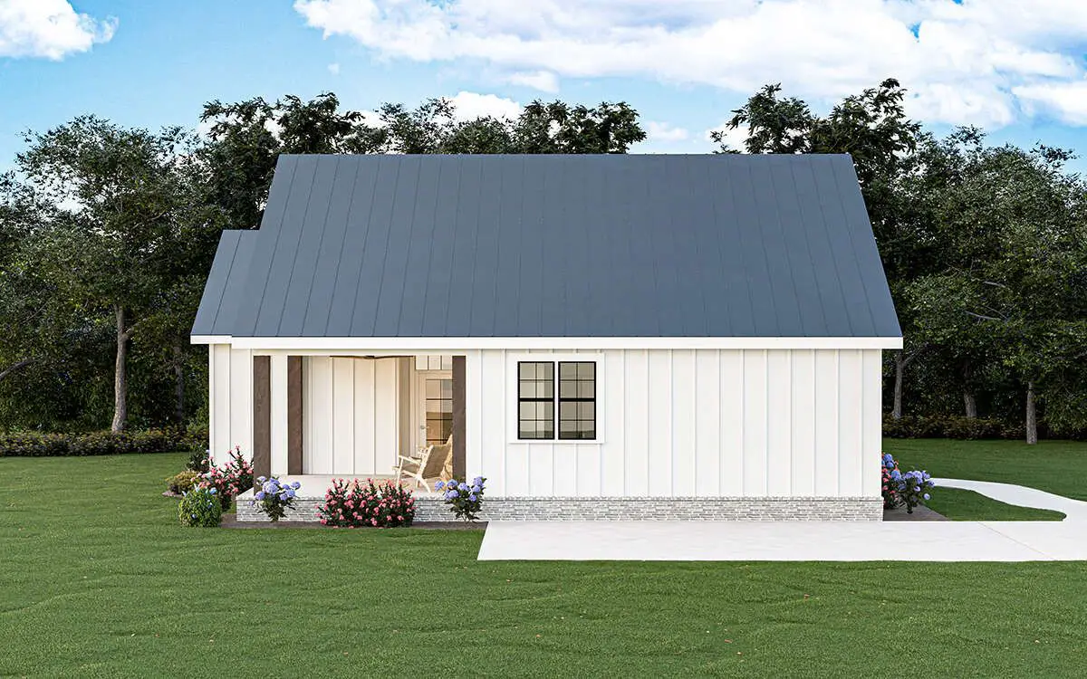 This modern farmhouse plan is cozy yet highly functional. The open main living space creates a sense of light and flow, while the bedroom layout ensures comfort and privacy. Its efficient use of space makes this home both easy to live in and easy to maintain, without sacrificing style or farmhouse character.