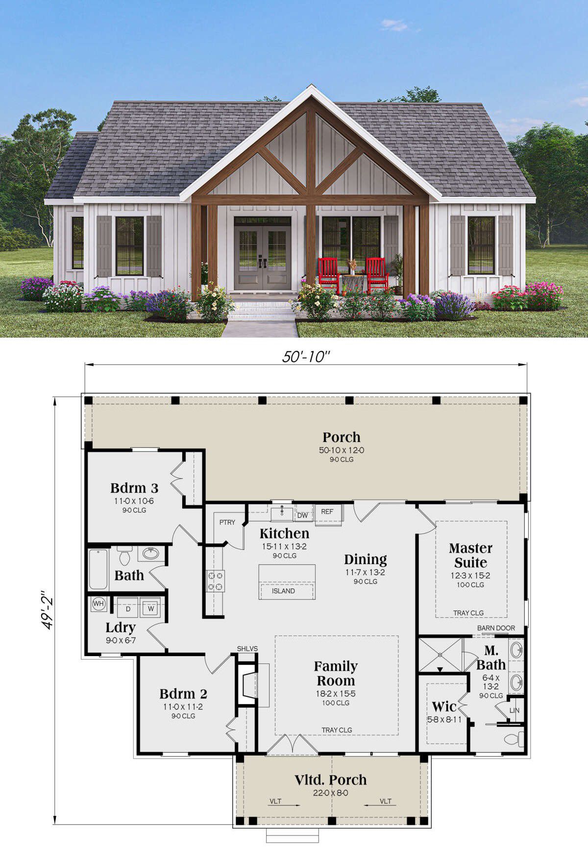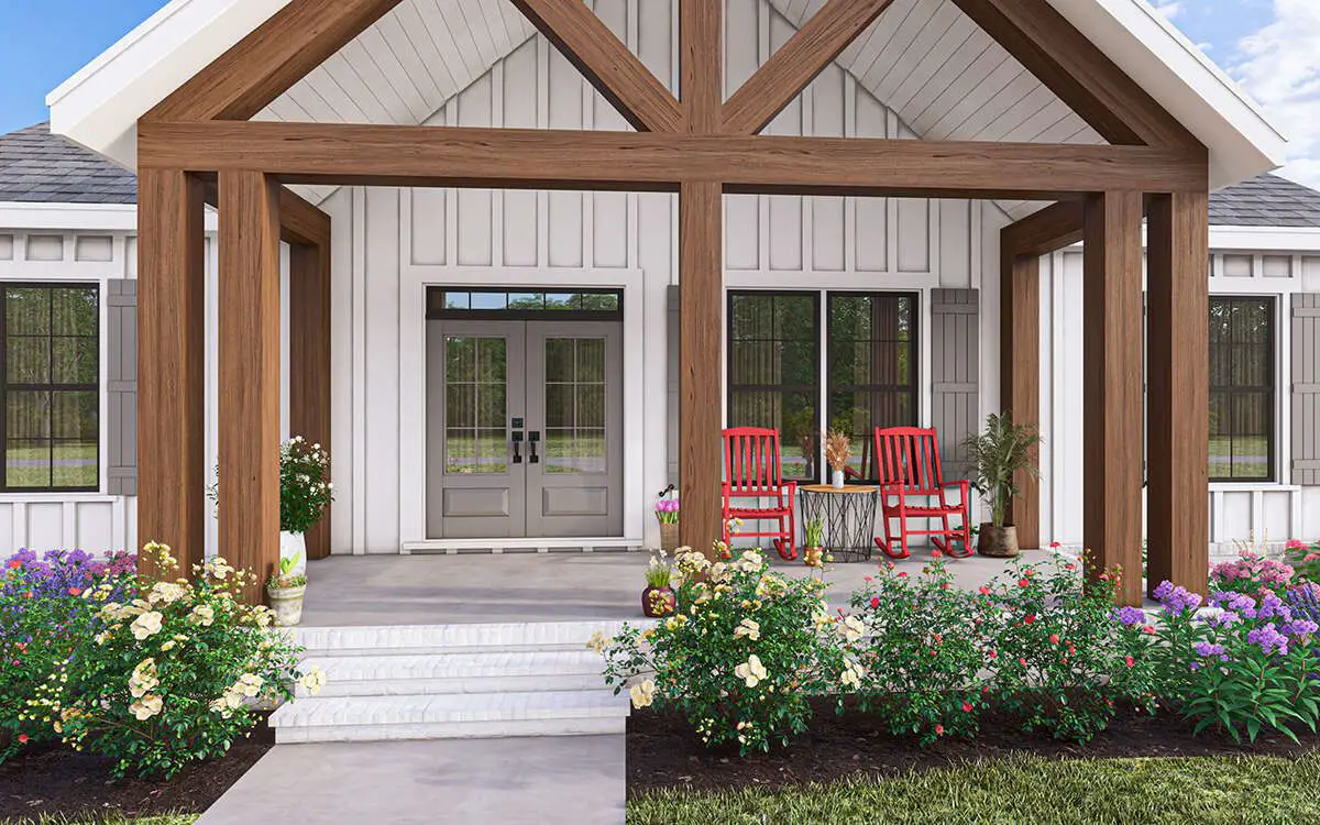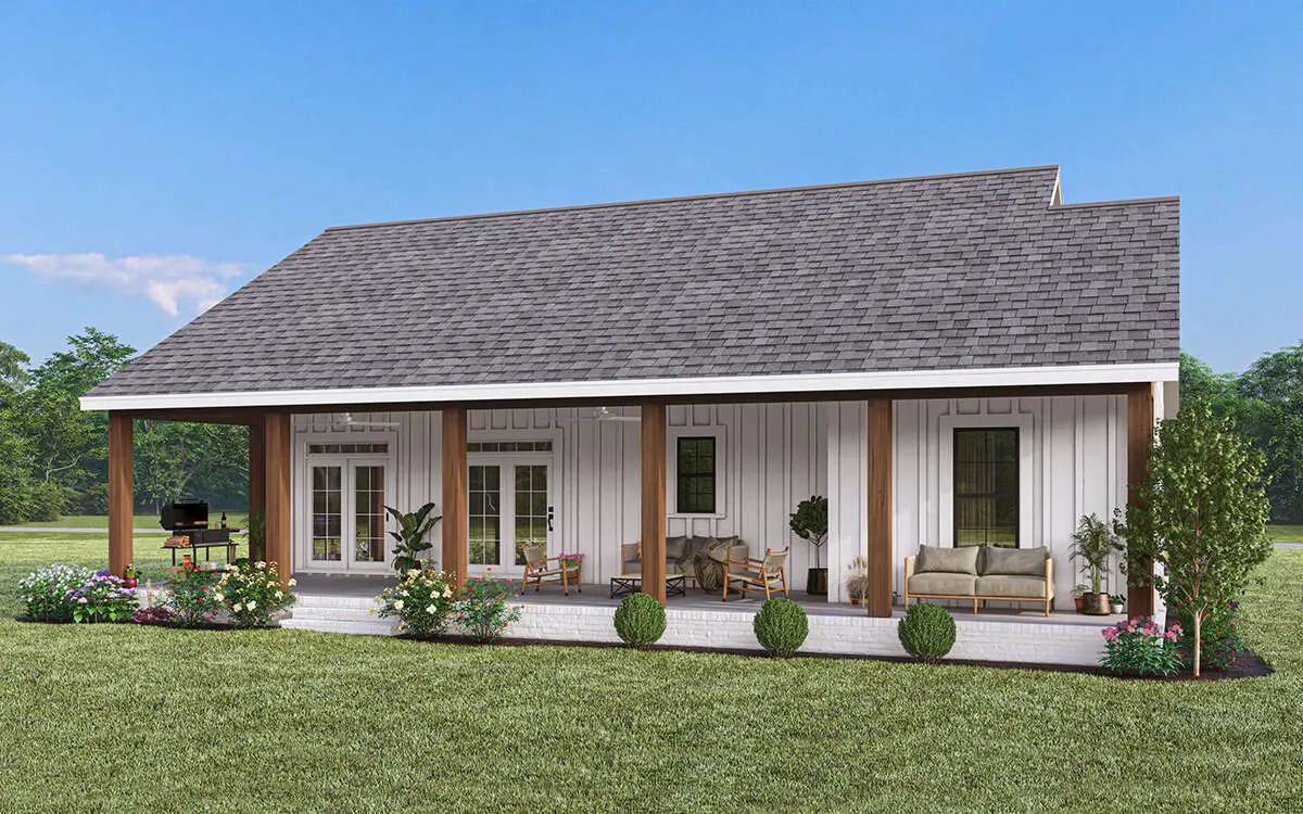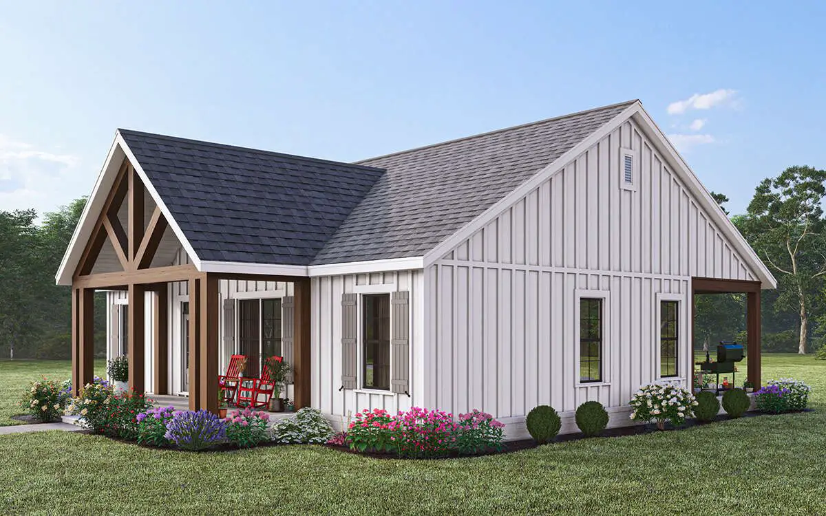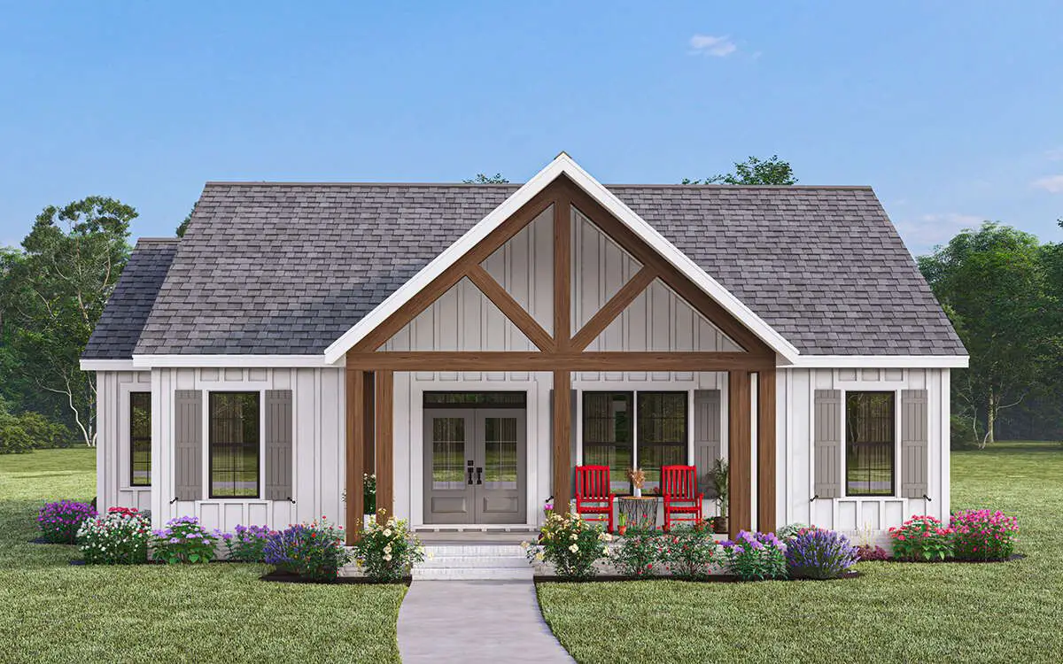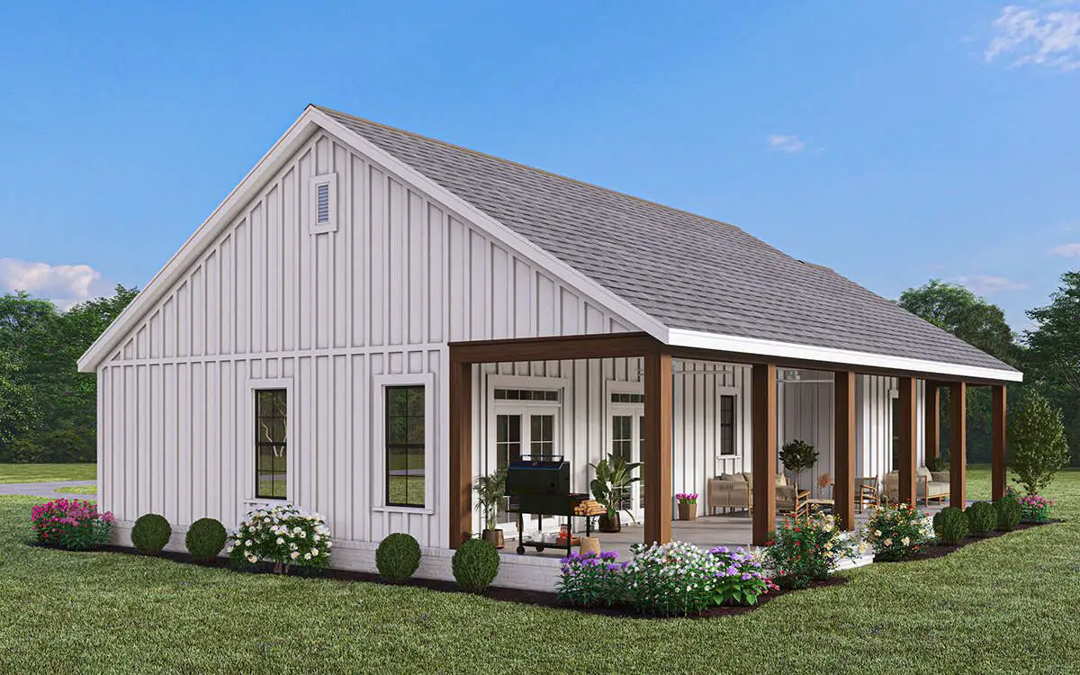 The exterior showcases timeless modern farmhouse elements—clean lines, board-and-batten siding, and a welcoming **covered front porch** that adds instant curb appeal. This design suits both rural settings and suburban neighborhoods alike, and the modest footprint works well on many lot sizes.