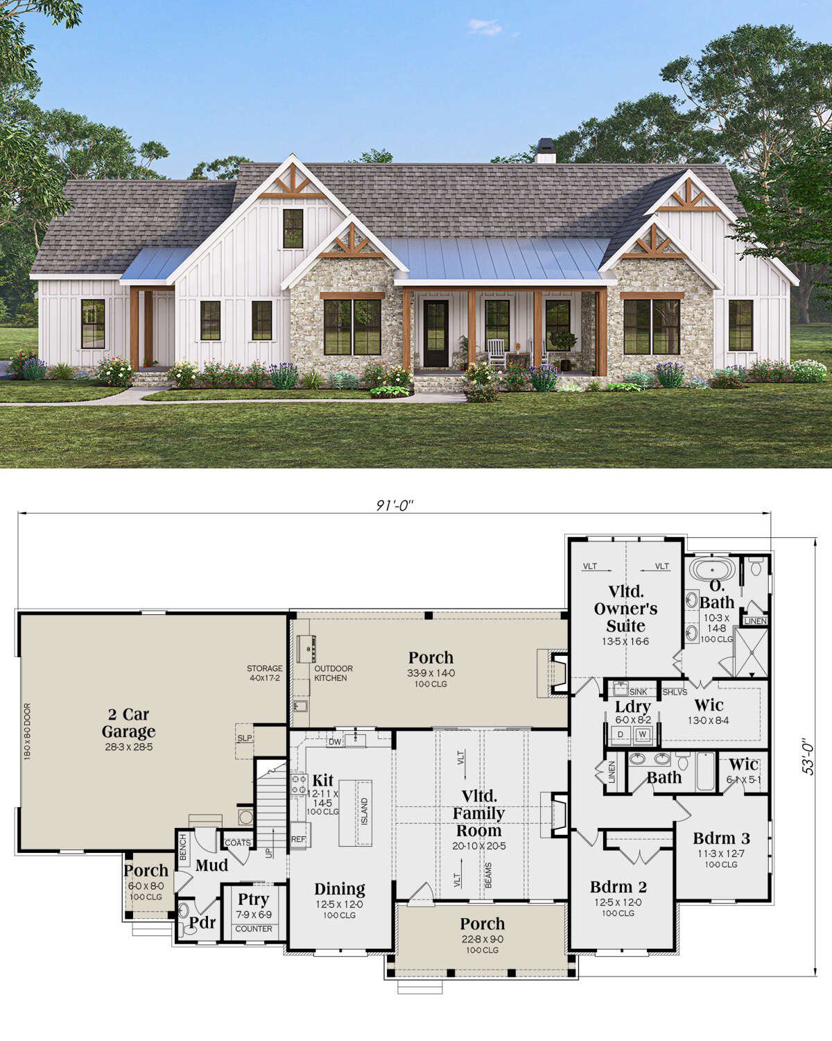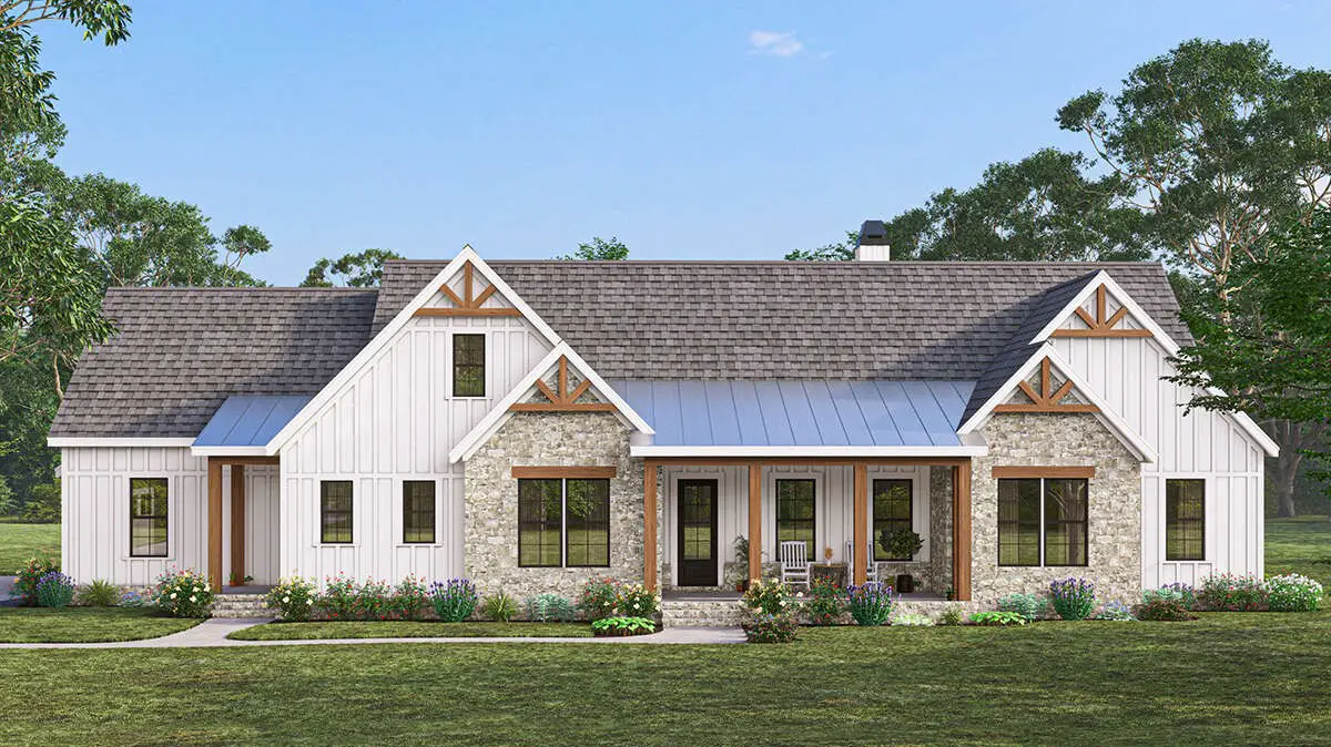 This **modern farmhouse plan** strikes the perfect balance between timeless farmhouse charm and flexible, functional living.
