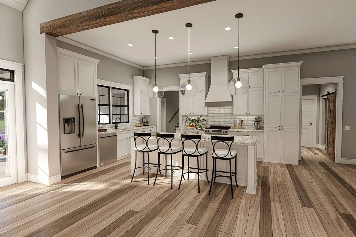 The modern farmhouse layout is designed to support both relaxed daily life and entertaining. The open living spaces encourage connection among family members and guests, while bedrooms and private areas offer comfortable retreats. With the optional fourth bedroom, this plan adapts easily to changing needs—whether you require a guest room, office, or hobby space.