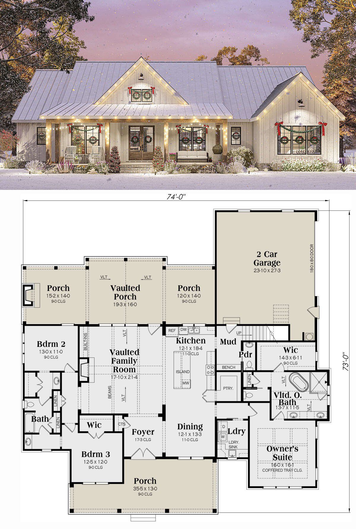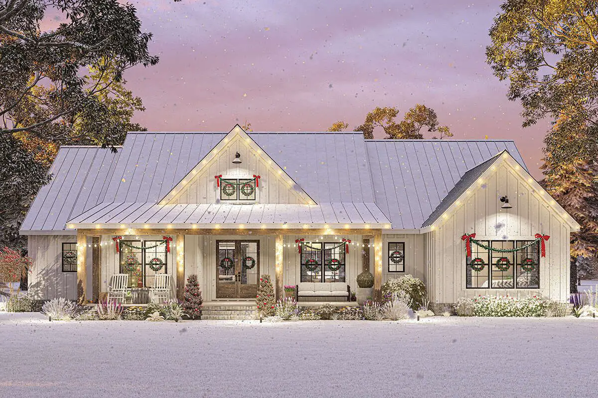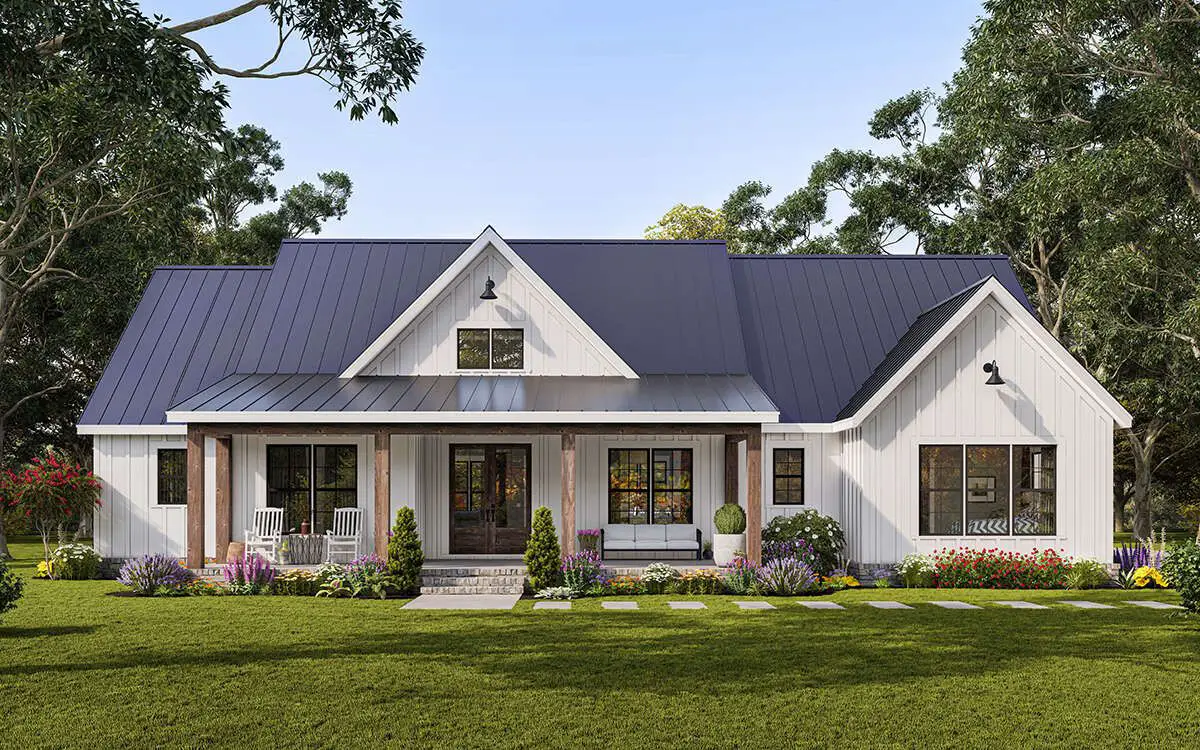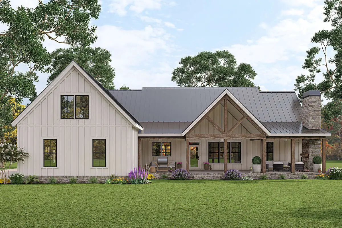 The exterior embraces modern farmhouse styling with clean lines, board-and-batten siding, and a covered **front porch** that invites you inside.