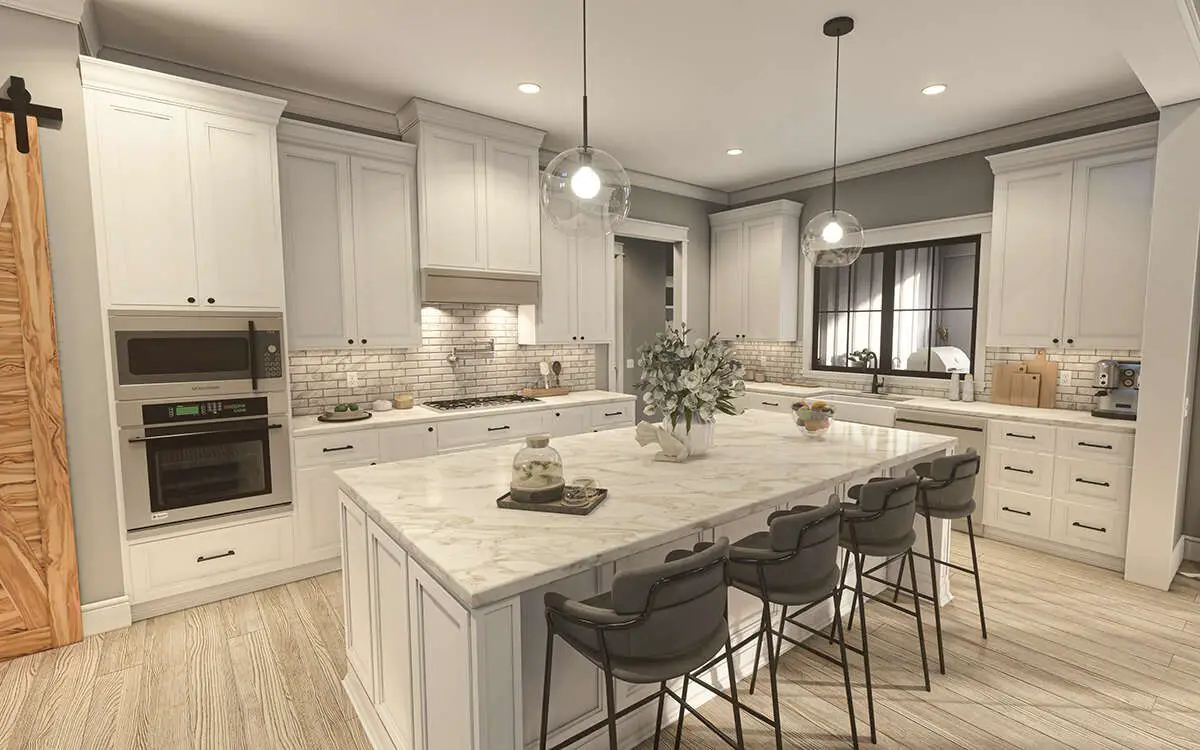 The kitchen includes a center island which provides casual seating and ample prep space, encouraging social gatherings and efficient meal preparation.