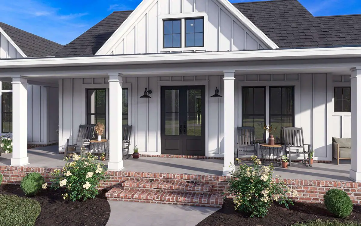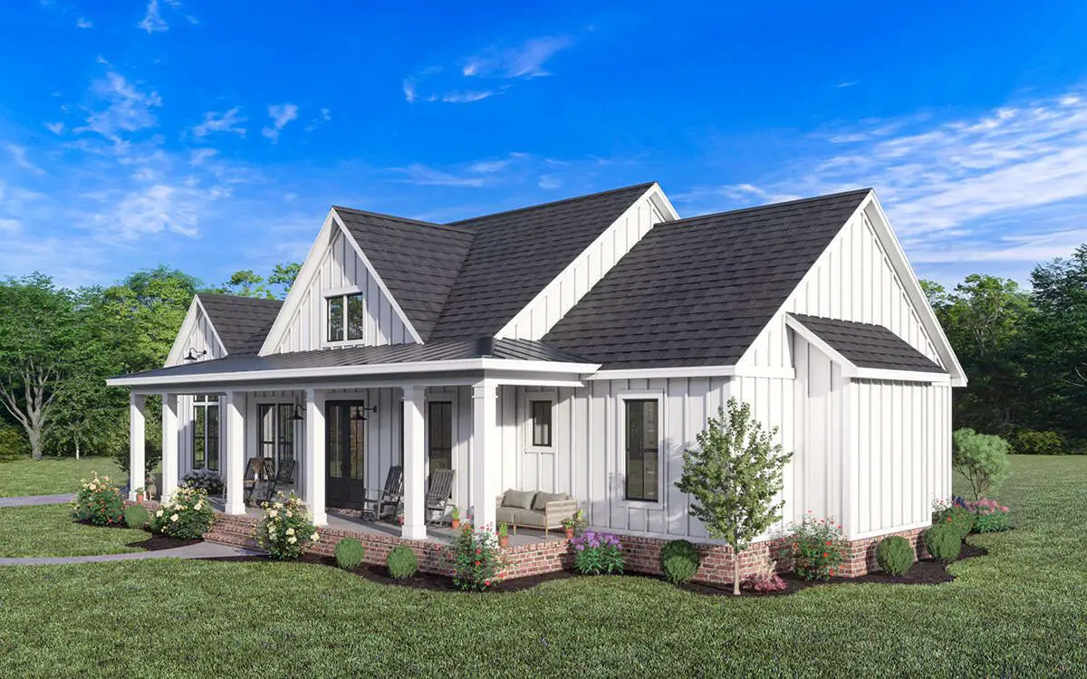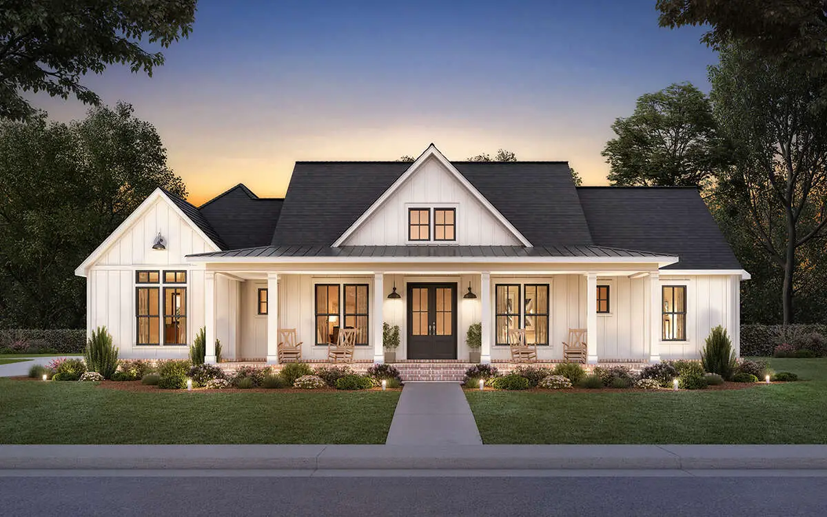 This home displays classic modern farmhouse elements such as clean siding, crisp rooflines, and a welcoming covered front porch that creates strong curb appeal.