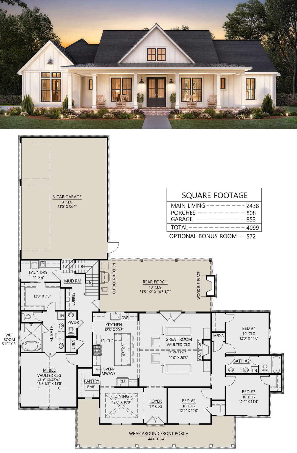 This design offers approximately 2,438 square feet of heated living space with **4 bedrooms**, **2 full bathrooms**, **1 half bathroom**, and a **3-car garage**—making it a perfect choice for families and those seeking functional, stylish living in a modern farmhouse format.
