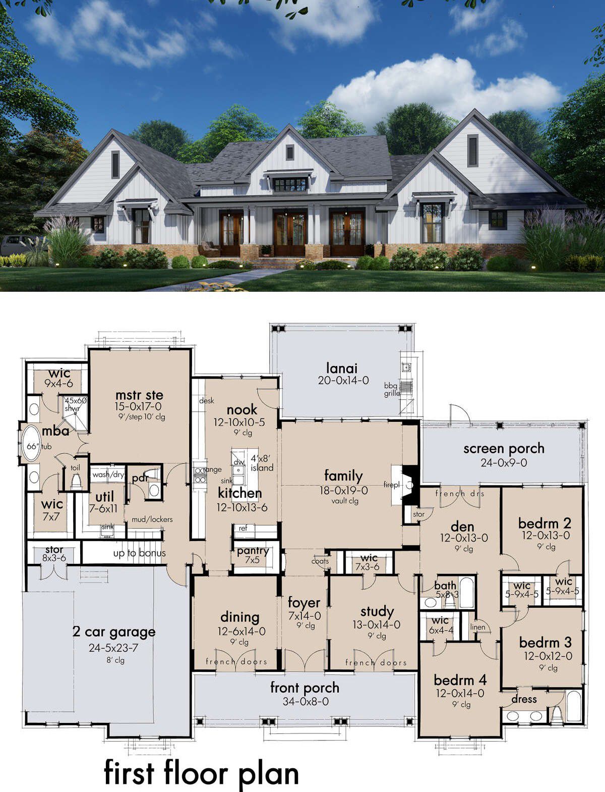 This modern farmhouse showcases timeless exterior details such as board-and-batten and lap siding, a welcoming covered front porch, and balanced rooflines with an 8:12 pitch. With overall dimensions of approximately 85′-6″ wide by 62′-9″ deep, it makes a strong but inviting presence on a variety of lot types.