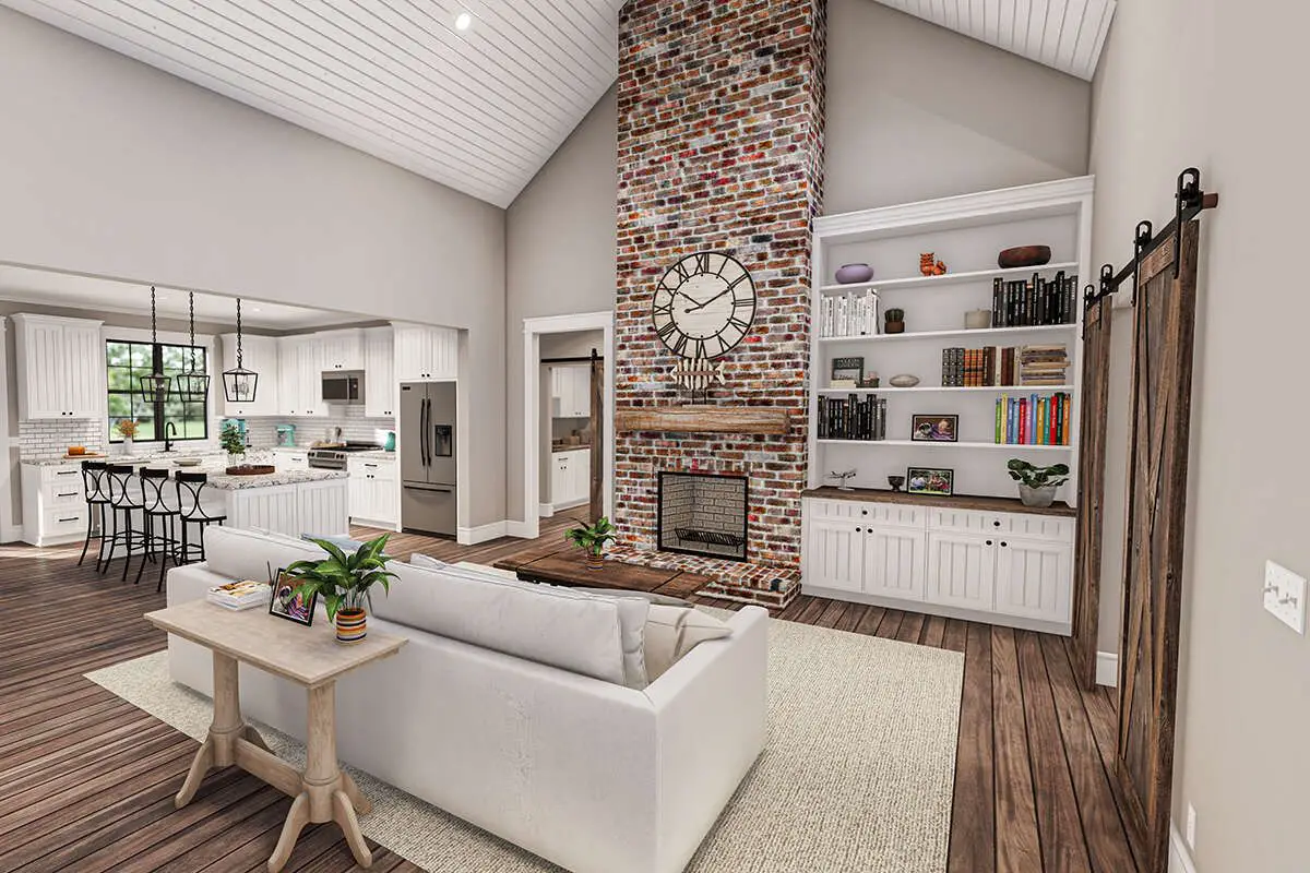 The great room is where this plan really shows off. A vaulted ceiling adds drama in the best way, and those dormer windows “rain sunshine” into the space so it stays bright throughout the day. There’s also a fireplace as a natural focal point, paired with built-in shelving—so you get both cozy vibes and practical storage/display space without needing to buy extra furniture to fill awkward corners.