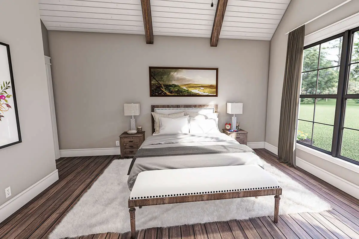 The owner’s suite is placed near the laundry room and mudroom—an intentional decision that makes daily routines smoother. The bedroom itself features a vaulted ceiling with exposed beams for that extra farmhouse charm, plus a large window that keeps the room feeling open and calm.