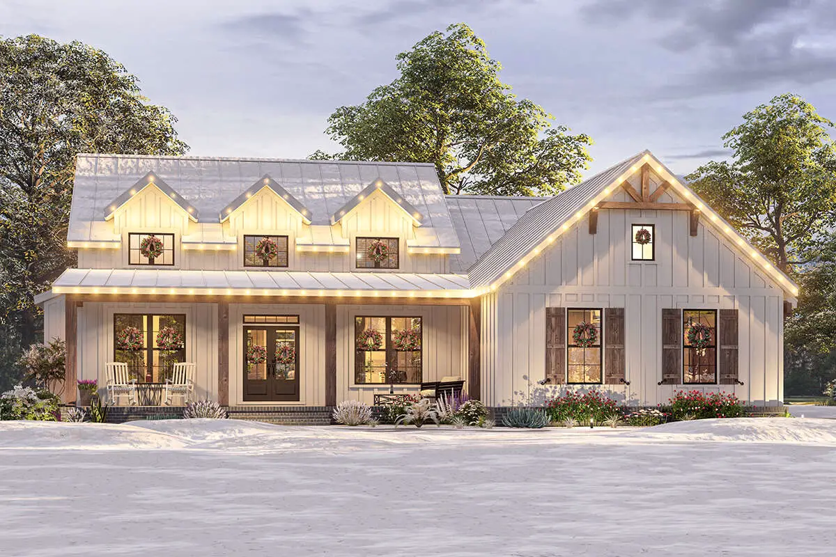 It delivers that warm farmhouse curb appeal—think board-and-batten character and gabled rooflines—then backs it up with smart interior flow, a split-bedroom setup, and the kind of “why doesn’t every house do this?” convenience that you’ll notice every single day.