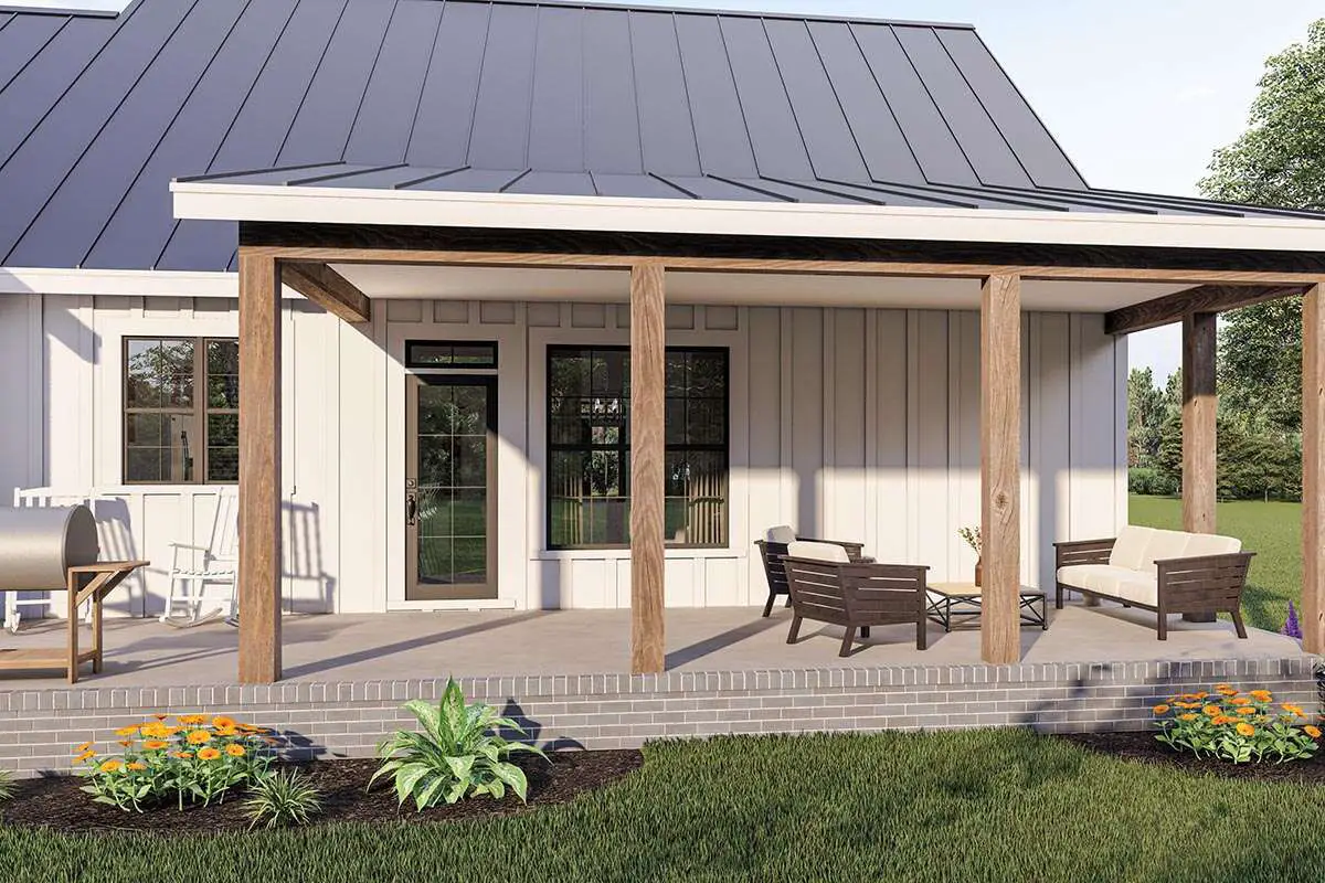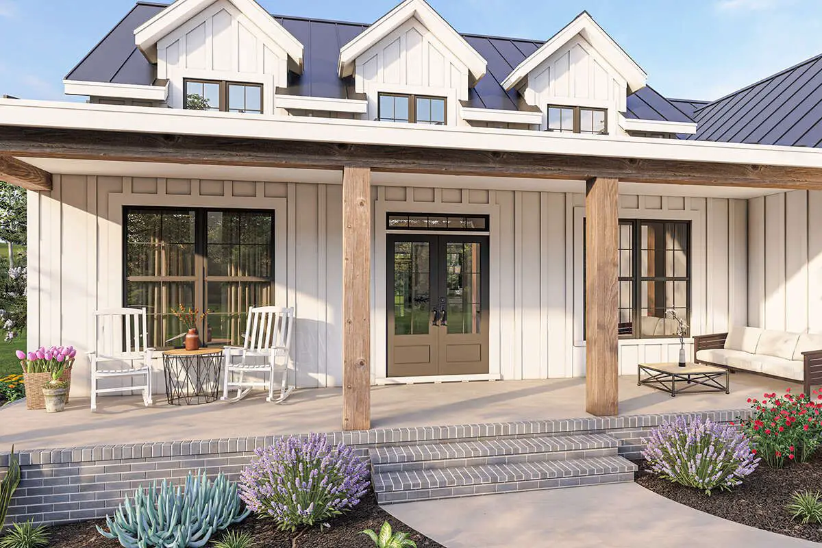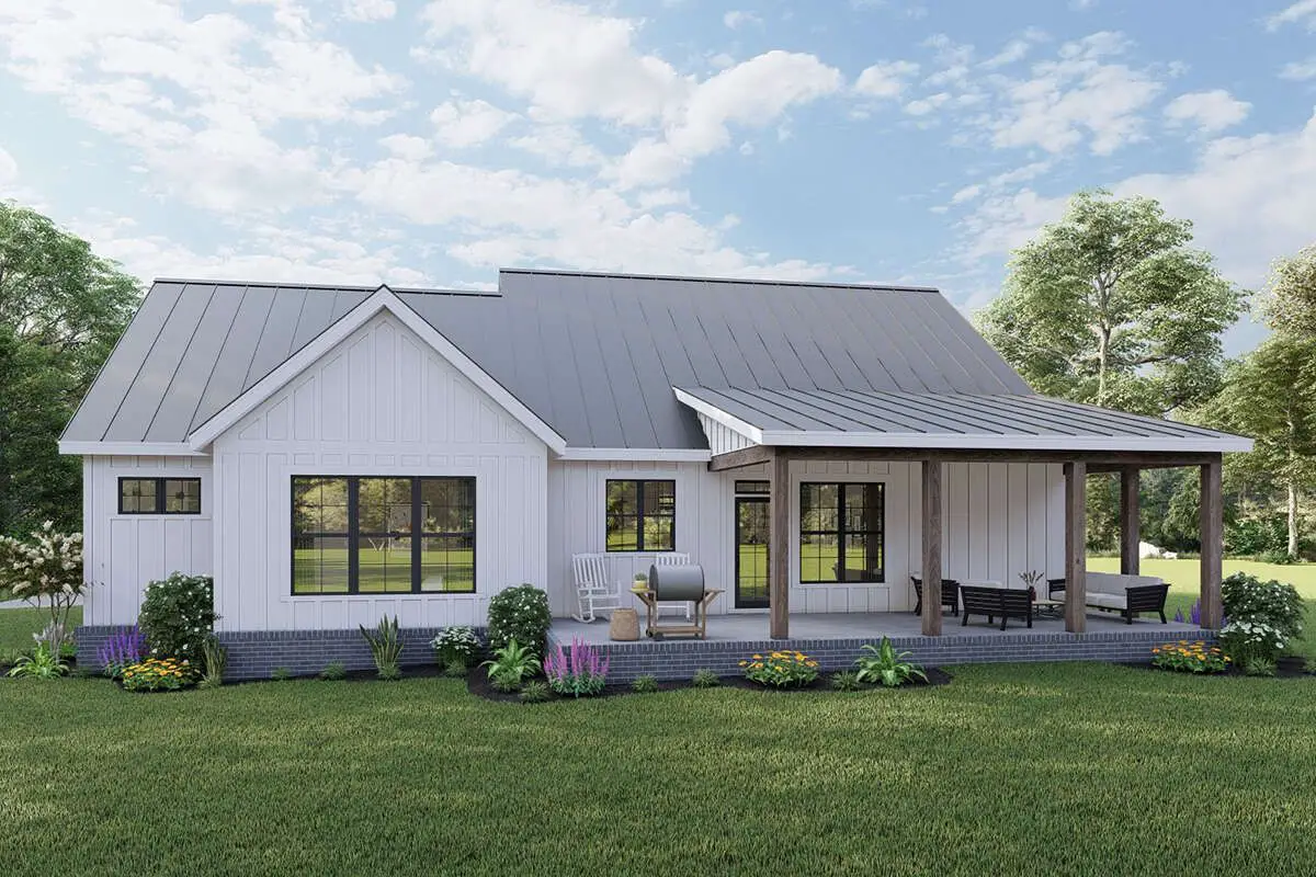This design includes generous outdoor spaces, which is exactly what a modern farmhouse should have. Whether you’re imagining morning coffee, evening chats, or letting kids burn energy while dinner finishes, the porch zones help extend your living space beyond the walls.
