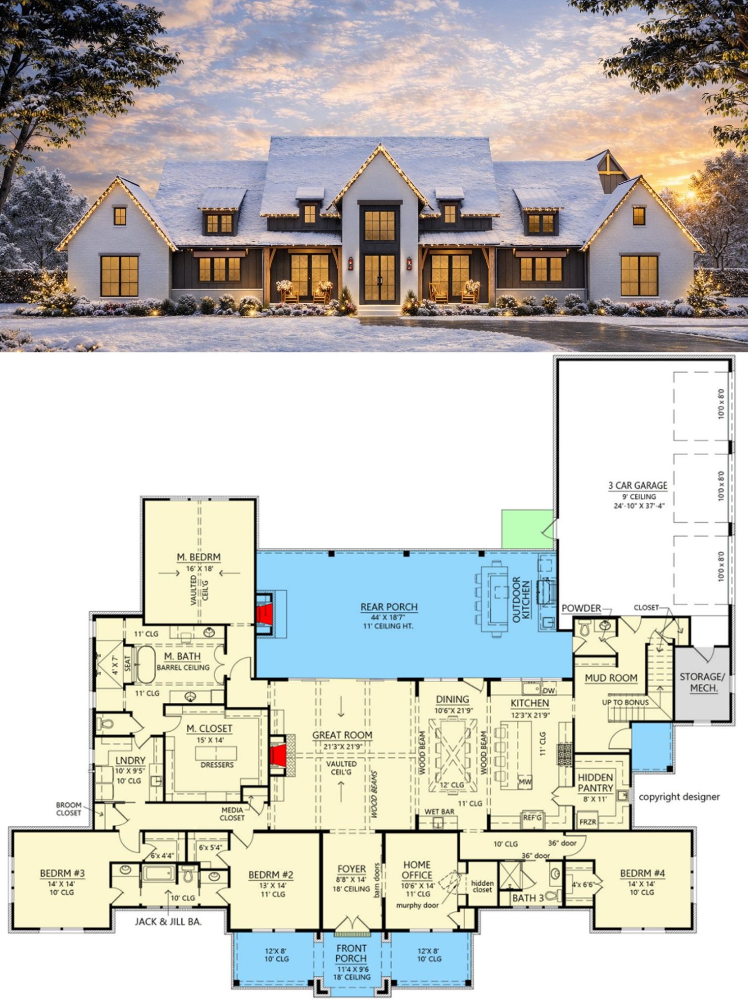 This **modern farmhouse plan** blends contemporary design, functional family living, and outdoor entertainment features.