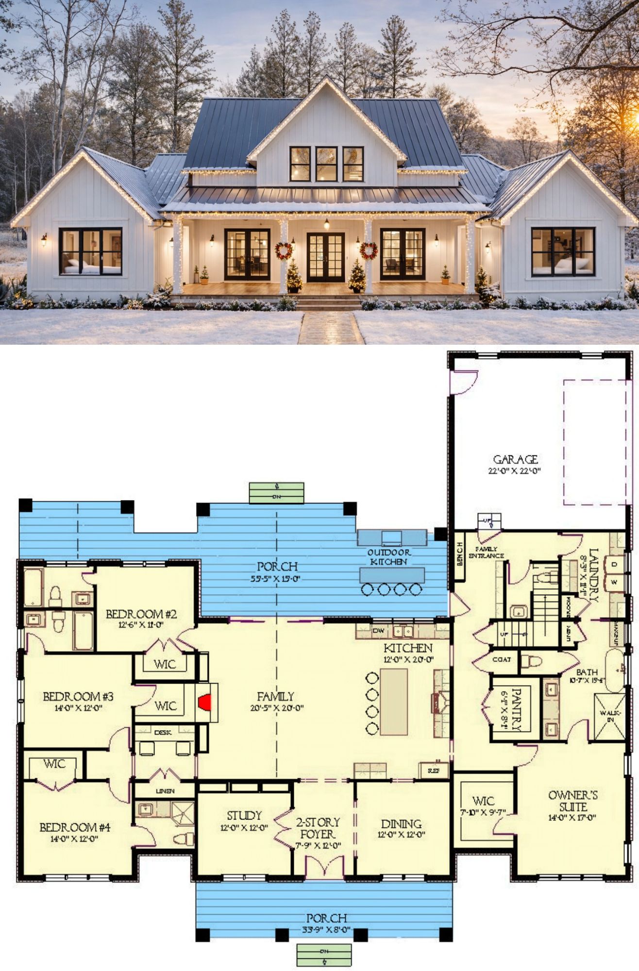 This **modern farmhouse plan** blends stylish design with functional family living.