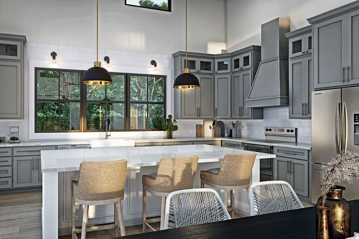 The kitchen typically features a central island for casual seating and food prep, with sightlines to the family and dining areas, supporting easy interaction during gatherings and daily routines.