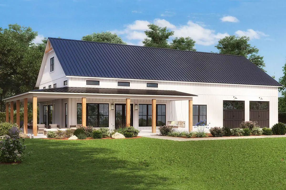 The exterior shows classic barndominium style with a simple rectangular footprint and a large front porch that adds charm and outdoor living space.