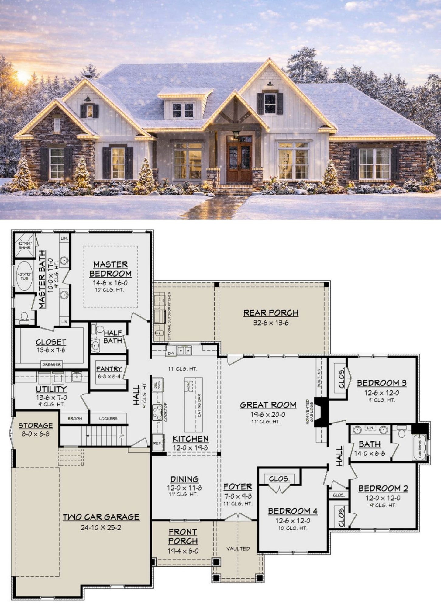 With a footprint around **76′-4″ wide by 67′-4″ deep**, this home has strong curb appeal on both suburban and rural lots. 1