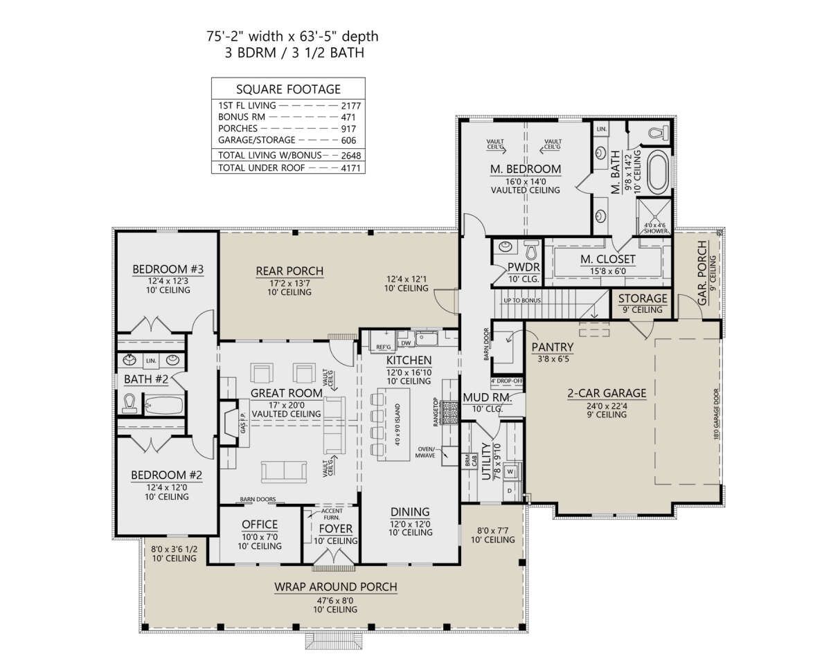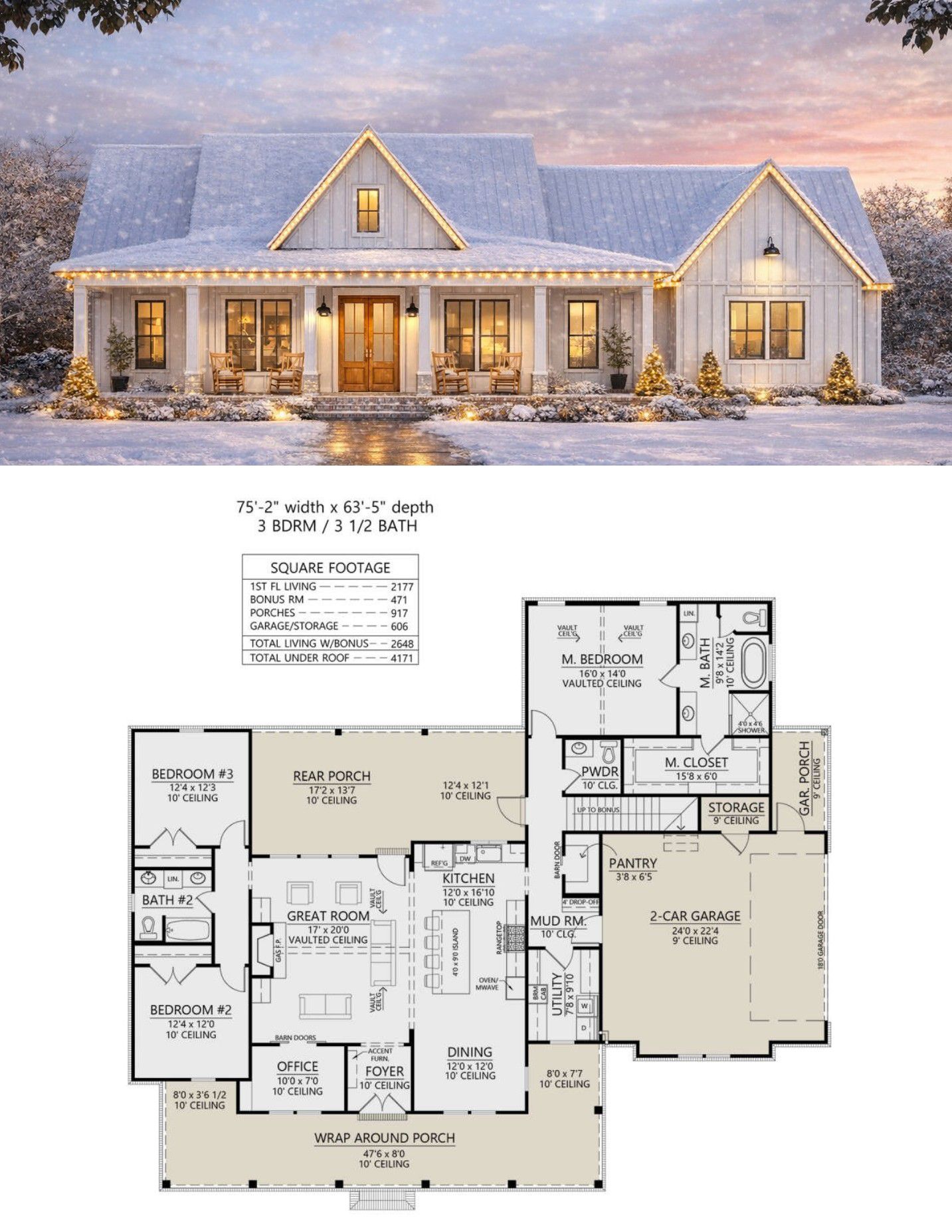 With overall exterior dimensions of about 75′-2″ wide by 63′-5″ deep, this design balances impactful curb appeal with efficient use of space suitable for suburban or rural lots. 1