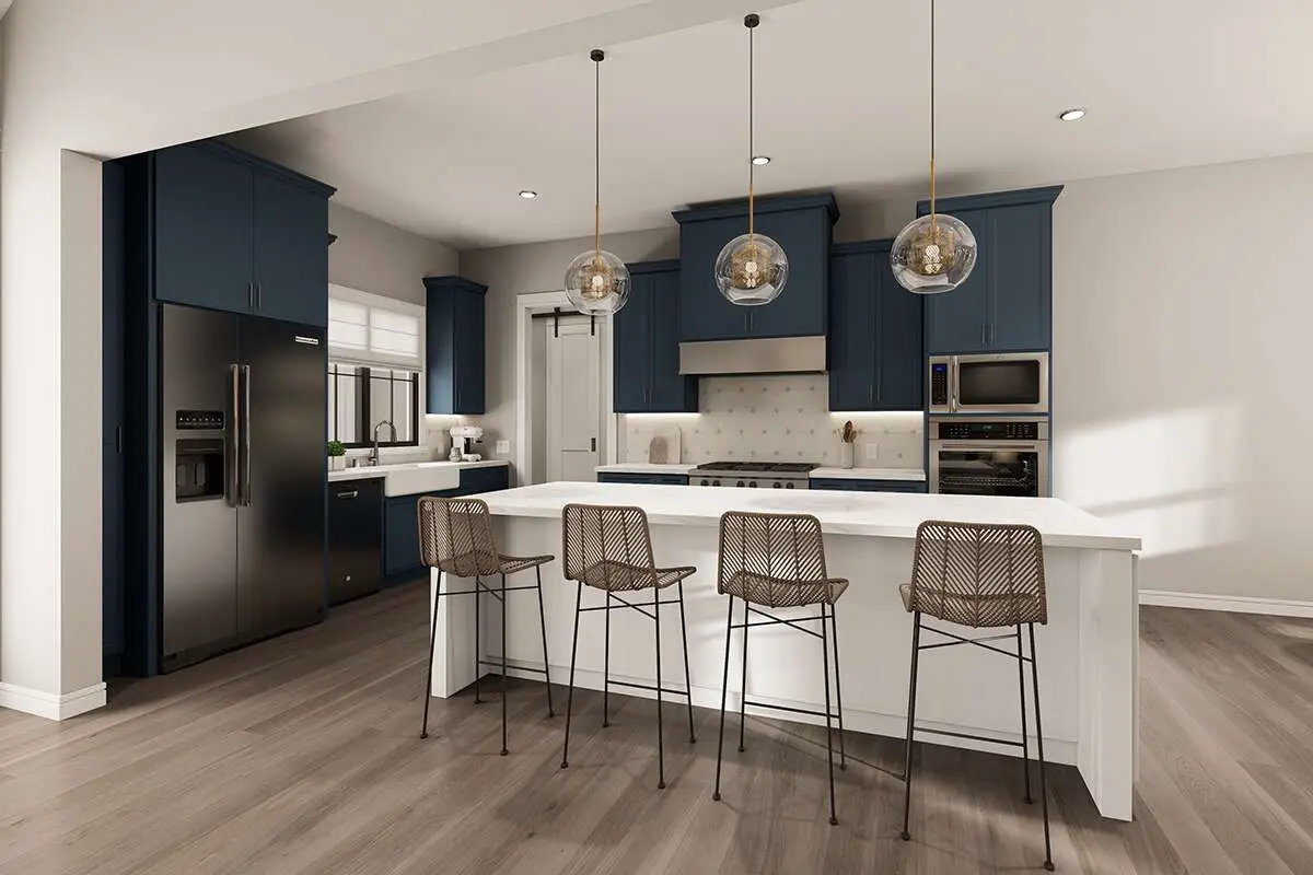 The kitchen features ample counter space, a center island with seating, and easy access to both indoor and outdoor living zones.