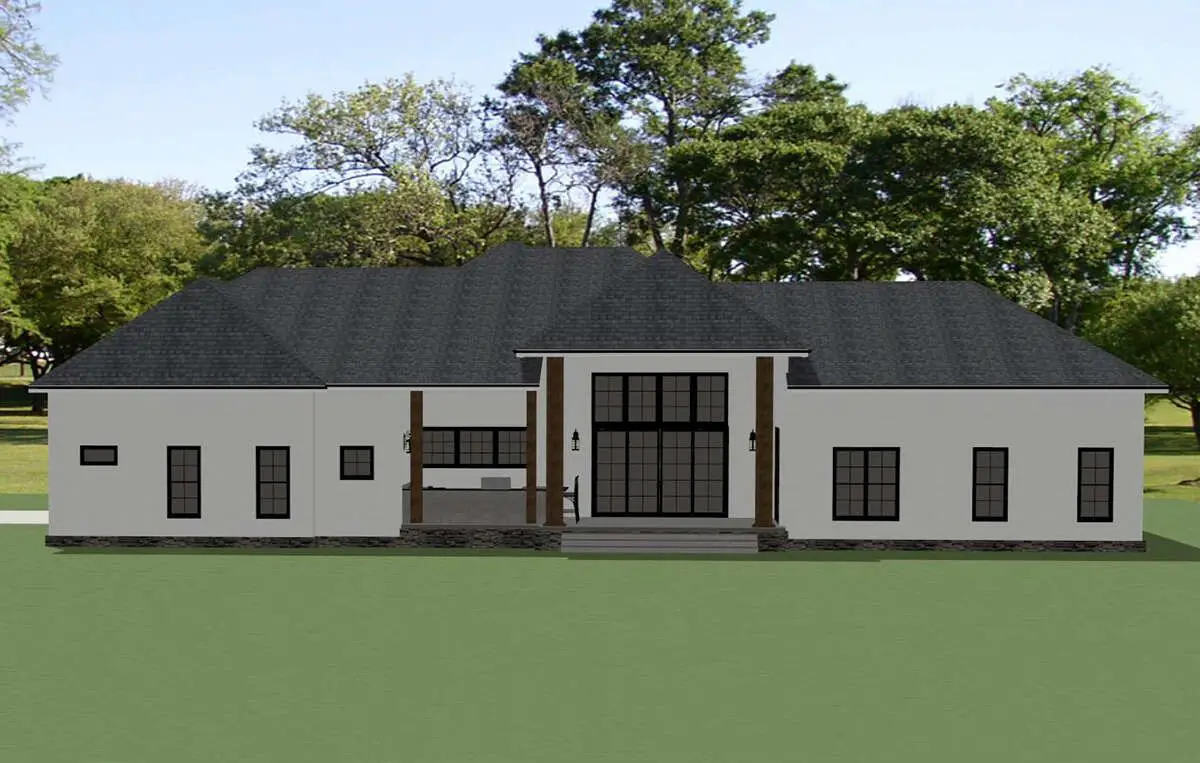 This **modern transitional house plan** combines contemporary design with functional family-friendly living in a spacious single-level layout.