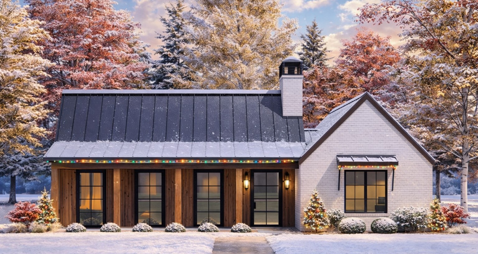 The exterior draws design cues from Scandinavian modern and classic farmhouse aesthetics, creating a contemporary but timeless look with clean lines and balanced proportions.