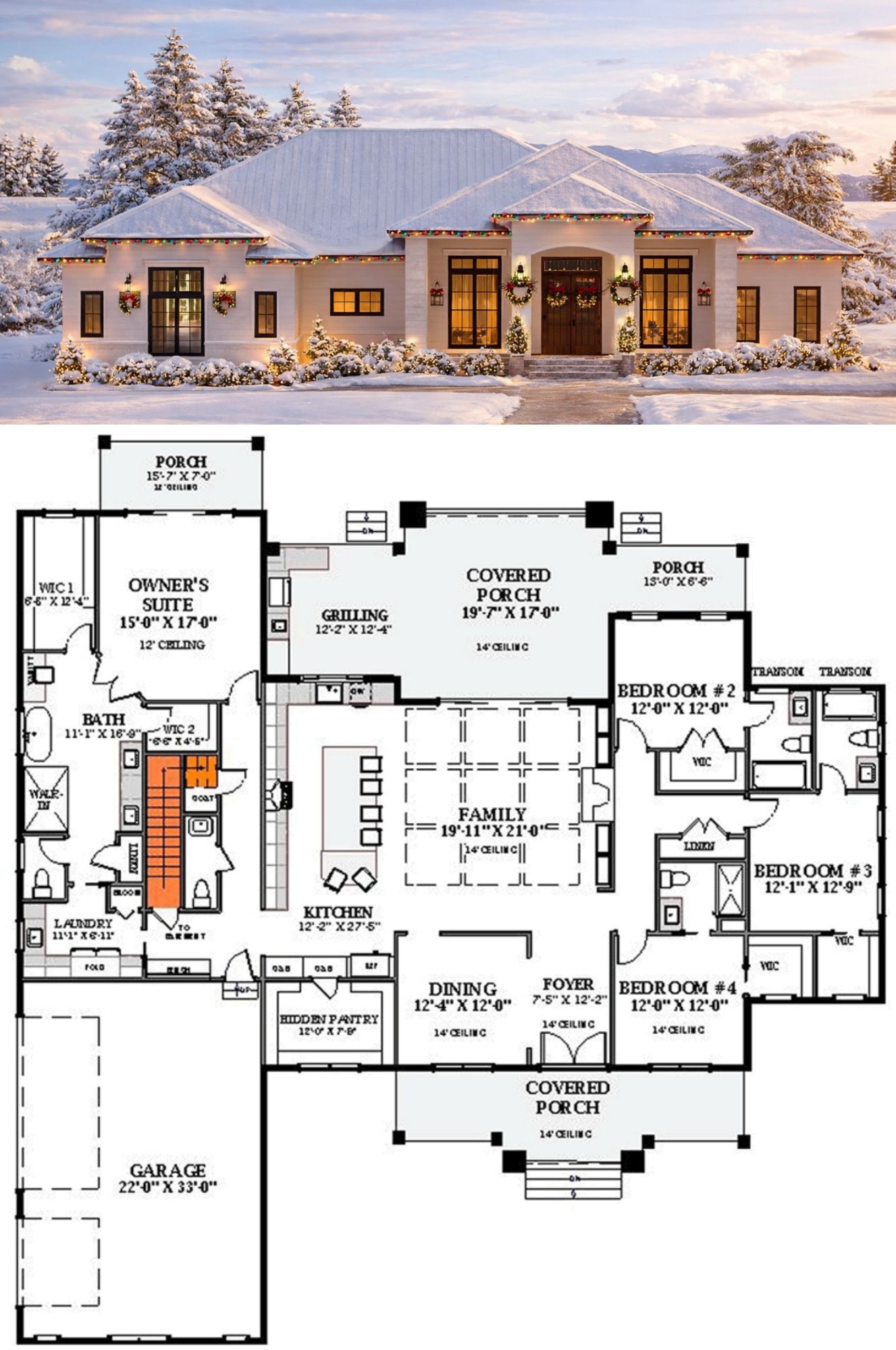 This elegant **transitional house plan** blends classic and modern design elements to create a beautifully functional home.