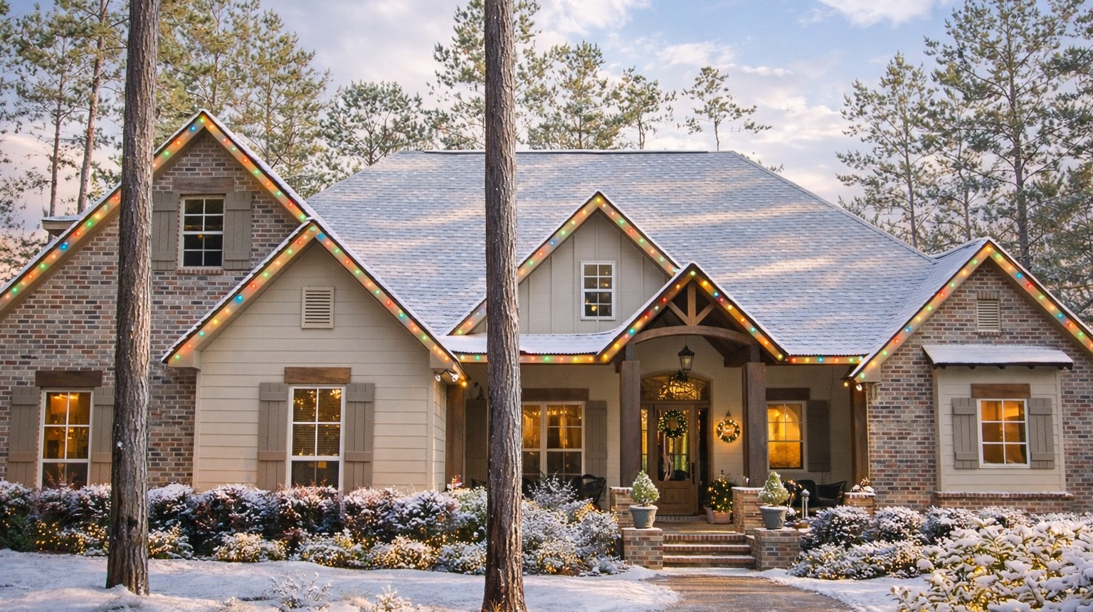 This home’s **rustic Craftsman exterior** blends natural textures like stone and wood with clean, balanced lines. A welcoming covered porch spans the front, creating a cozy outdoor living area and enhancing curb appeal. The rooflines and mixed materials give the home a timeless yet up-to-date look.