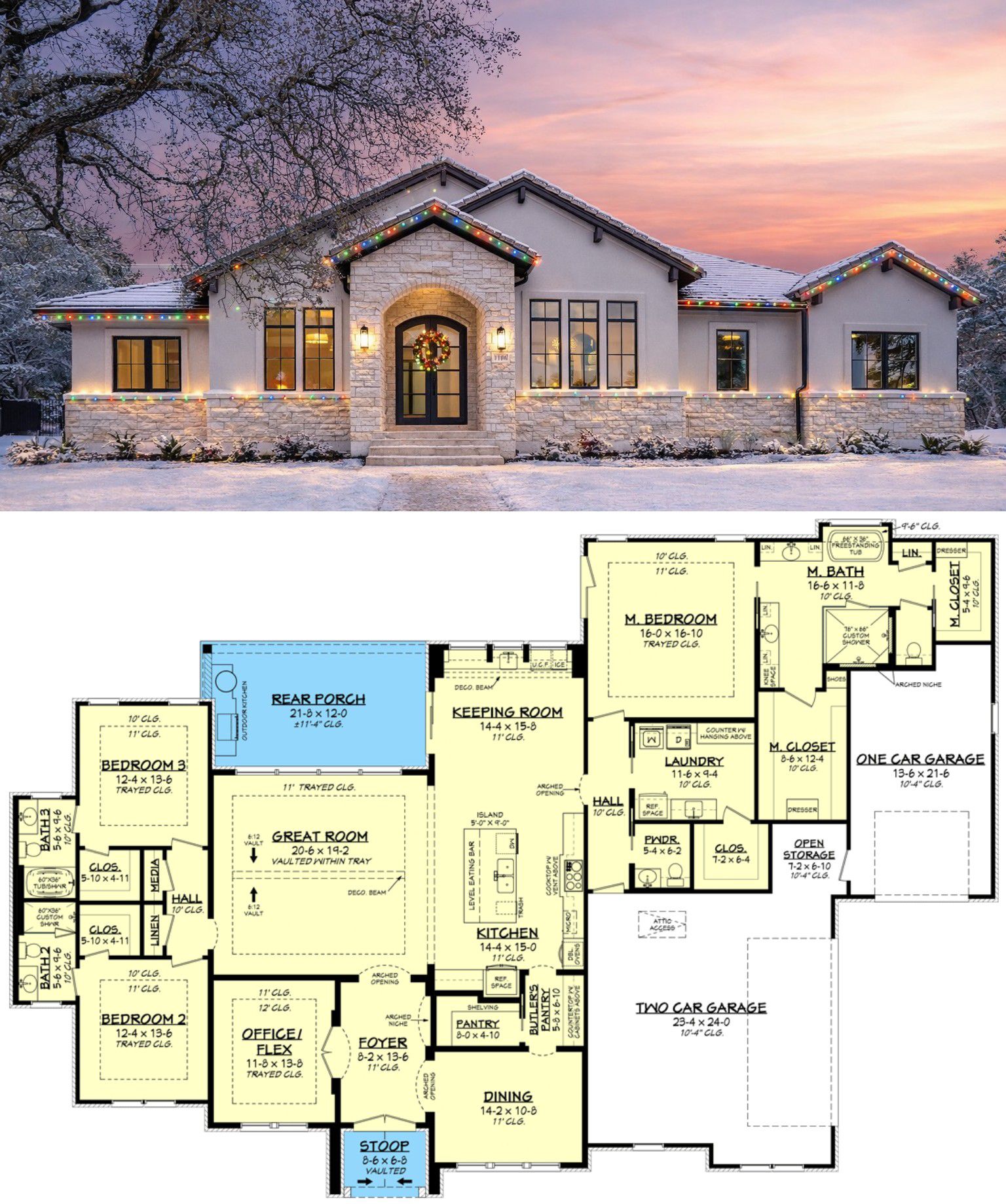 This Hill Country plan is designed for comfortable living and versatile daily use. The open-concept shared spaces and keeping room encourage family connection, while the home office and private bedrooms support quiet and productive zones. Spacious porches blend interior and exterior living, making it easy to enjoy fresh air and outdoor views.