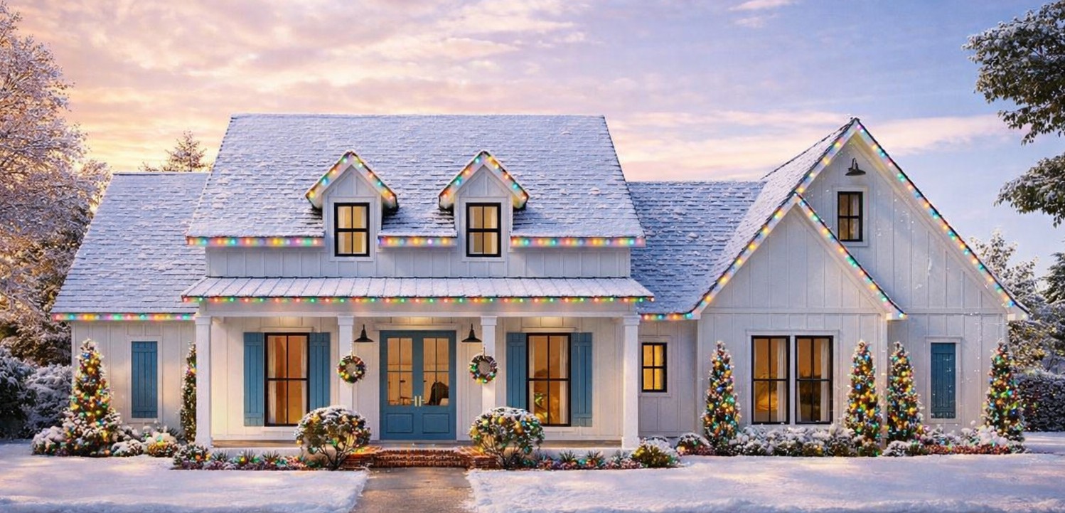 The exterior reflects modern farmhouse styling with clean lines, balanced proportions, and welcoming covered porch elements. The façade brings a classic yet contemporary feel that fits both rural and suburban settings.