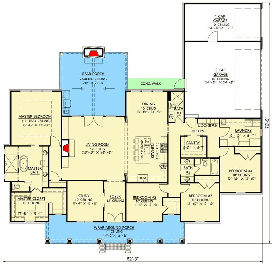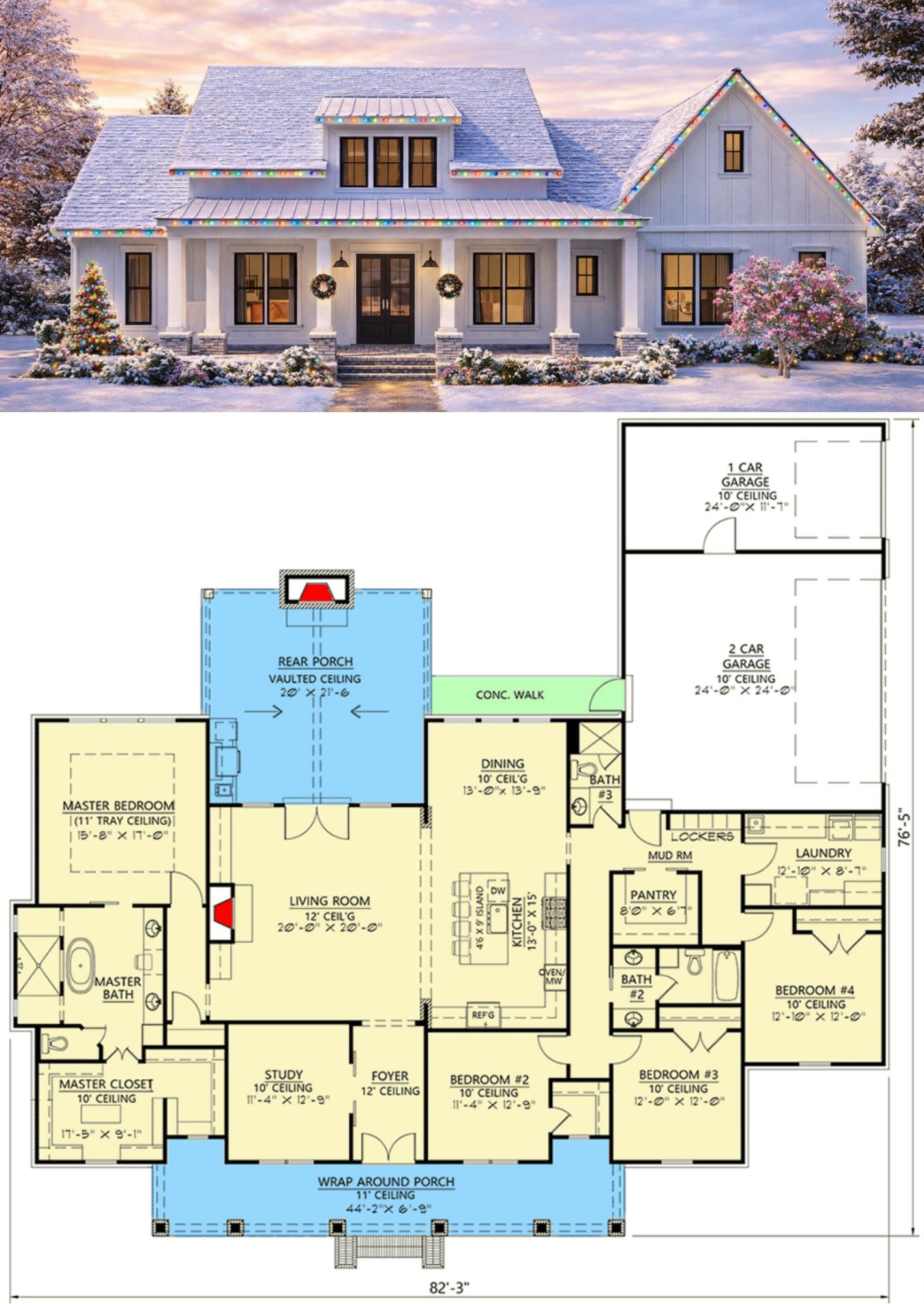 This modern farmhouse plan is crafted for flexible family life—with open, connected shared spaces and private bedroom zones that enhance comfort. The **vaulted rear porch** becomes a true second living area, perfect for entertaining or enjoying morning coffee. Practical spaces like the kitchen pantry, mudroom/laundry, and home office help keep everyday routines smooth and organized.