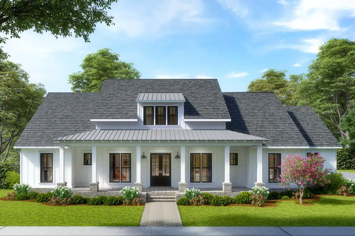 This stylish **Modern Farmhouse plan** beautifully combines classic farmhouse charm with contemporary open living.