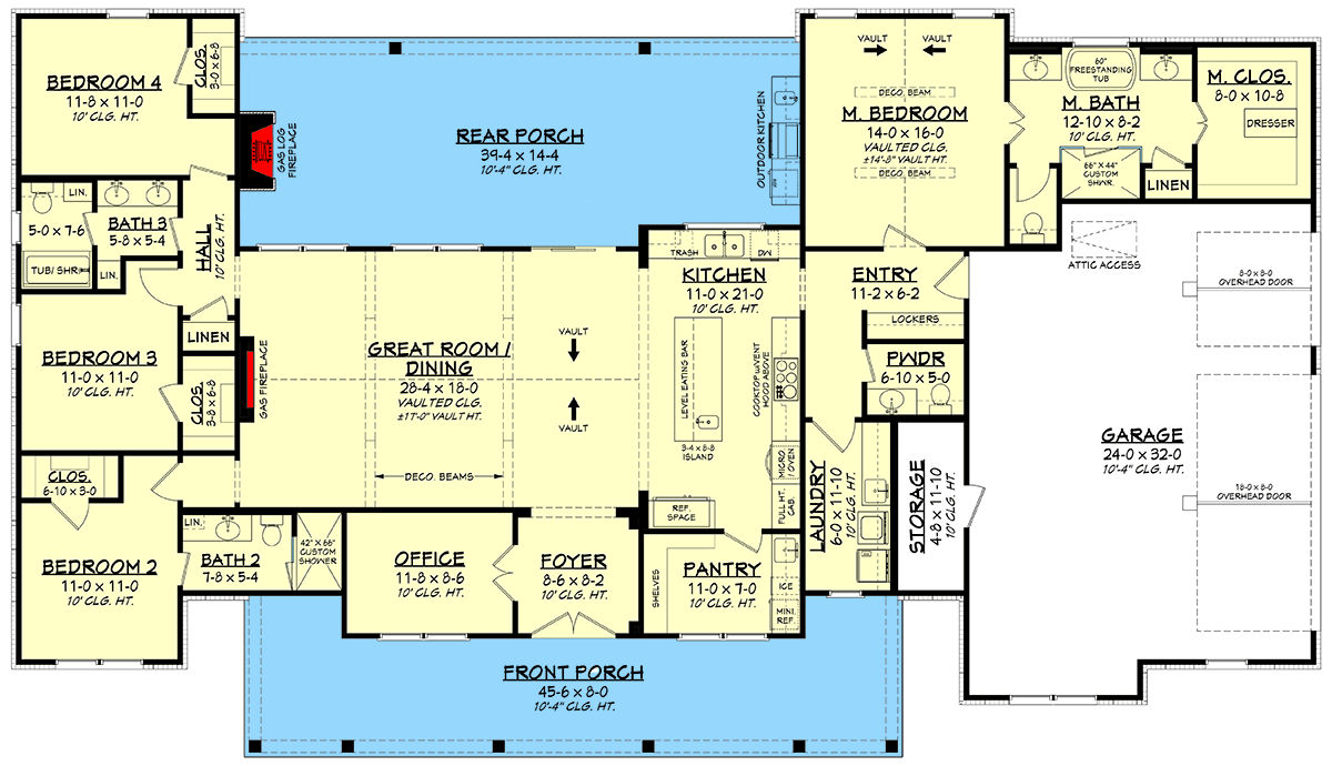 - Notable Interior Features: 10′ foyer ceiling, vaulted great room/dining, gas fireplace, decorative beams, large kitchen island, walk-in pantry, mudroom + laundry, vaulted primary suite