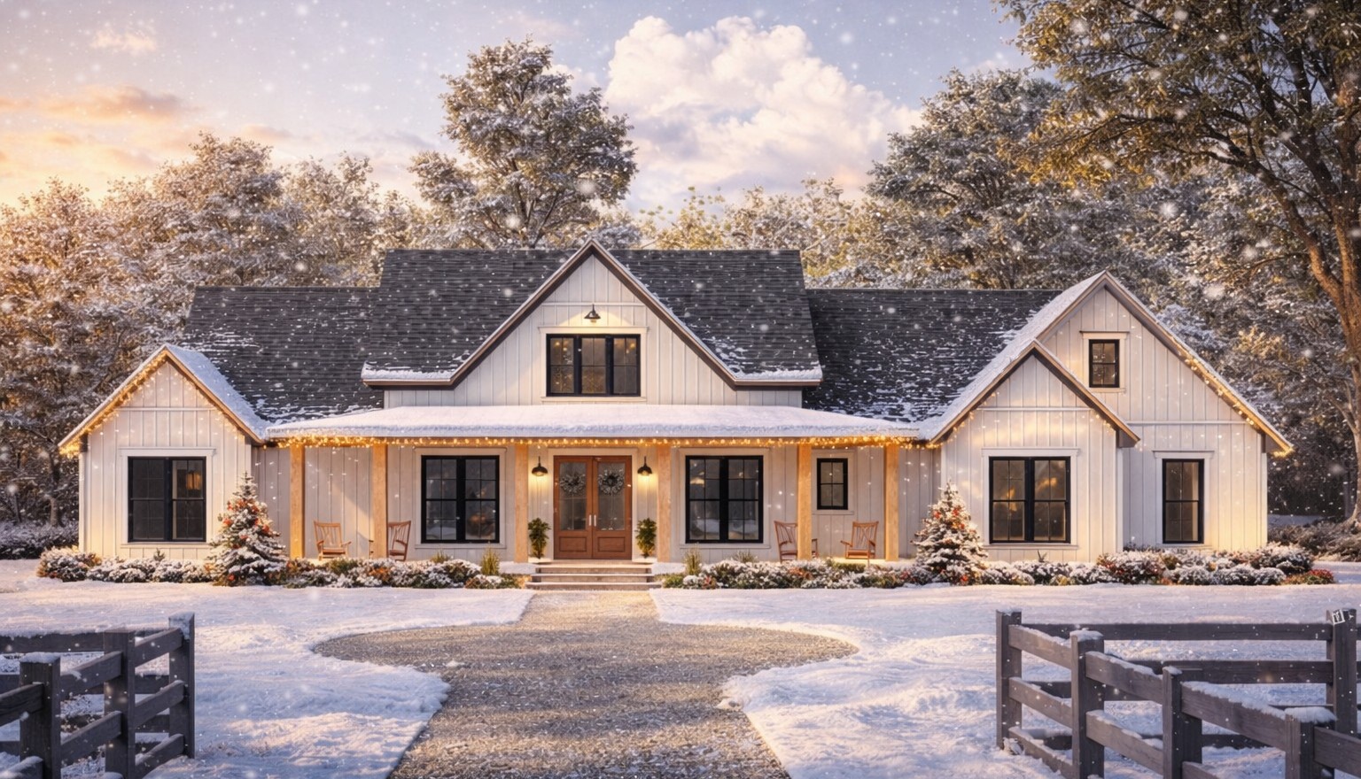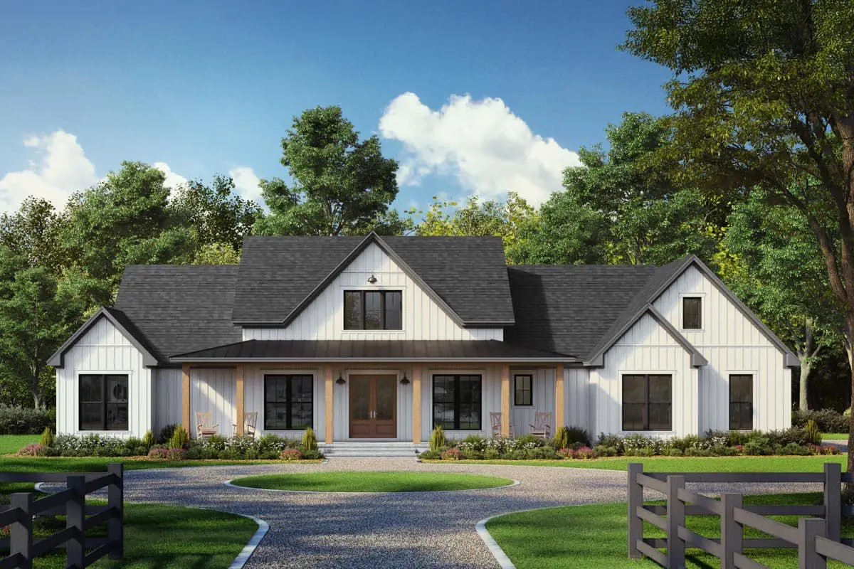 This design leans into that modern farmhouse look people love—clean lines, welcoming porch presence, and a balanced, “settled” feel from the street. The standout right away is the generous front porch, giving the home a friendly, come-on-up-and-sit-a-while vibe.