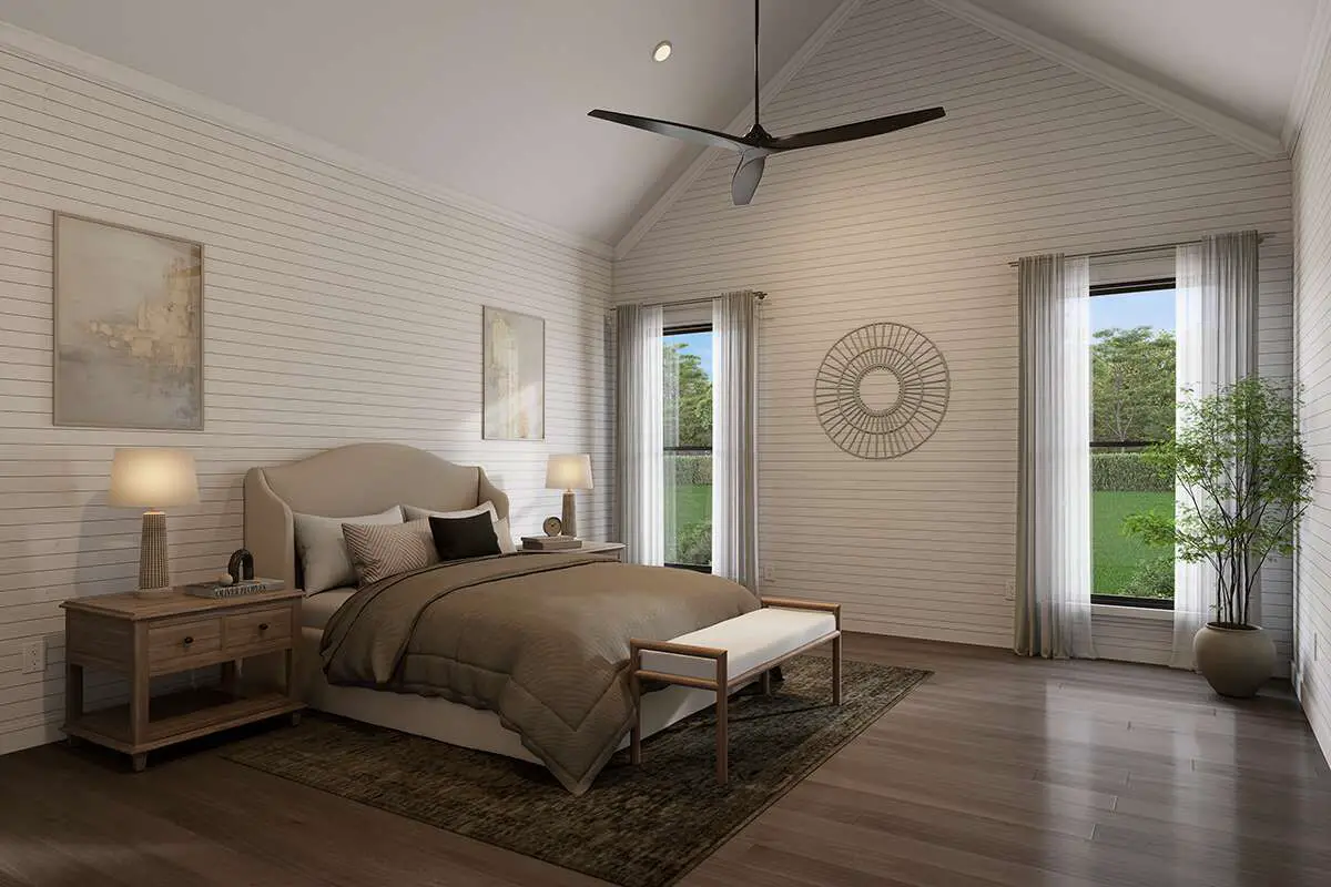 The primary suite is placed for privacy and comfort, featuring a vaulted ceiling that makes the bedroom feel open and relaxing. It’s separated from the secondary bedrooms, which is great for early sleepers, late sleepers, and everyone who just wants a little peace.