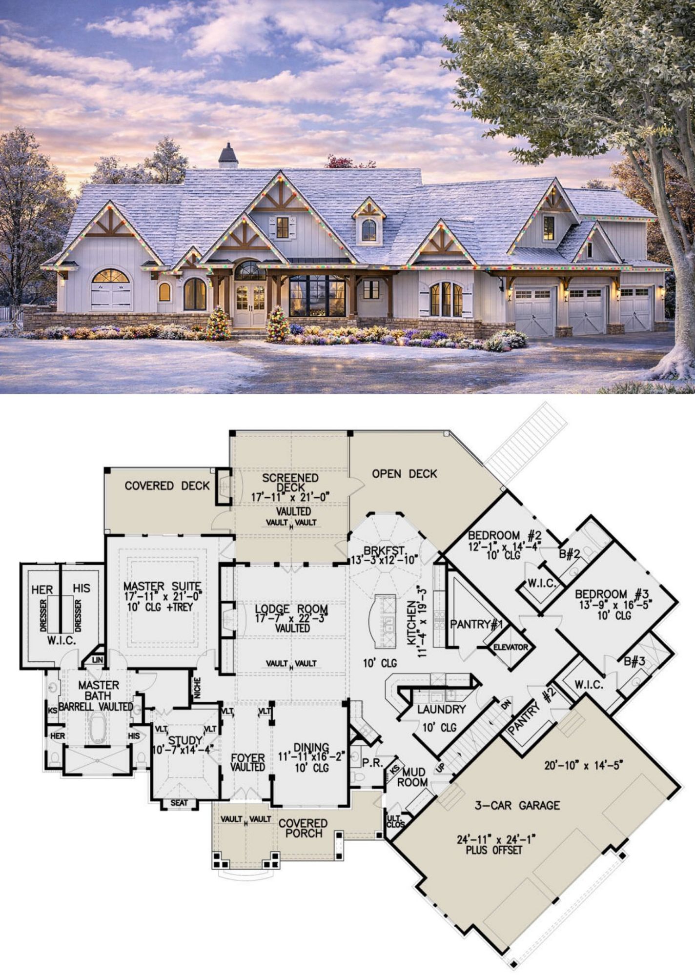 This plan includes flexible spaces such as a study/office and a media room—perfect for homework, work-from-home days, or entertainment. Vaulted ceilings and architectural details like built-ins and decorative trim enhance both form and function. 4