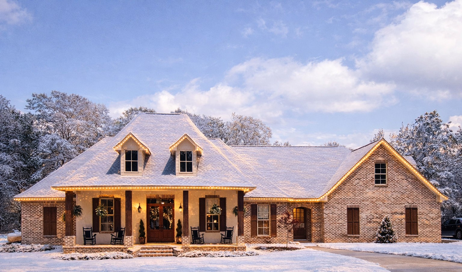 The exterior conveys timeless French Country character with elegant rooflines and design details influenced by Acadian and Southern styles. The covered front porch and coordinated façade elements create welcoming curb appeal that suits both rural and upscale suburban settings.