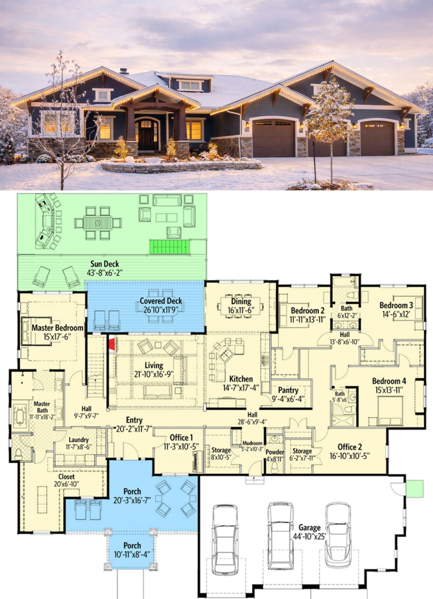 This Rustic Craftsman plan is ideal for families who value **generous gathering areas**, **private bedroom zones**, and **flexible space**. The open main living area connects naturally with expansive outdoor living spaces, while ample office and bonus areas support work, study, and recreation. With the optional lower level finished, this home can adapt to growing families or multigenerational needs. 22