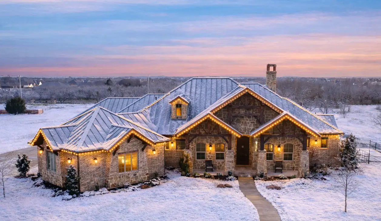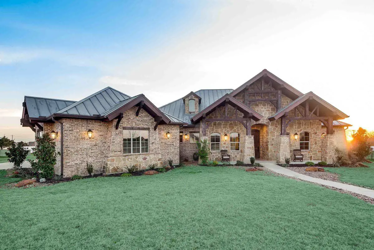 This home leans hard into rustic charm in the best way. Timber-framed gables rise above a stone exterior, giving the front elevation that bold, grounded look you usually see in high-end mountain communities and Hill Country estates.