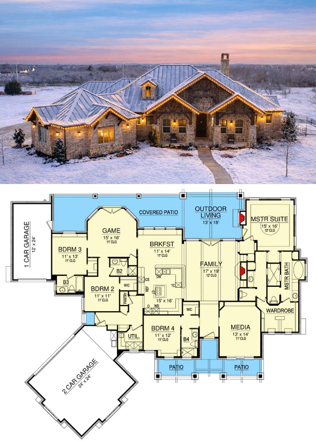 If you’ve ever looked at a stone-and-timber home and thought, “Yep… that’s the one I’d pull up to with muddy boots and a big grin,” this rugged Hill Country design is speaking your language. With 3,065 square feet of heated living space, four bedroom suites, four full bathrooms, a game room, and a media room, it’s equal parts cozy lodge and modern-day headquarters for real life.